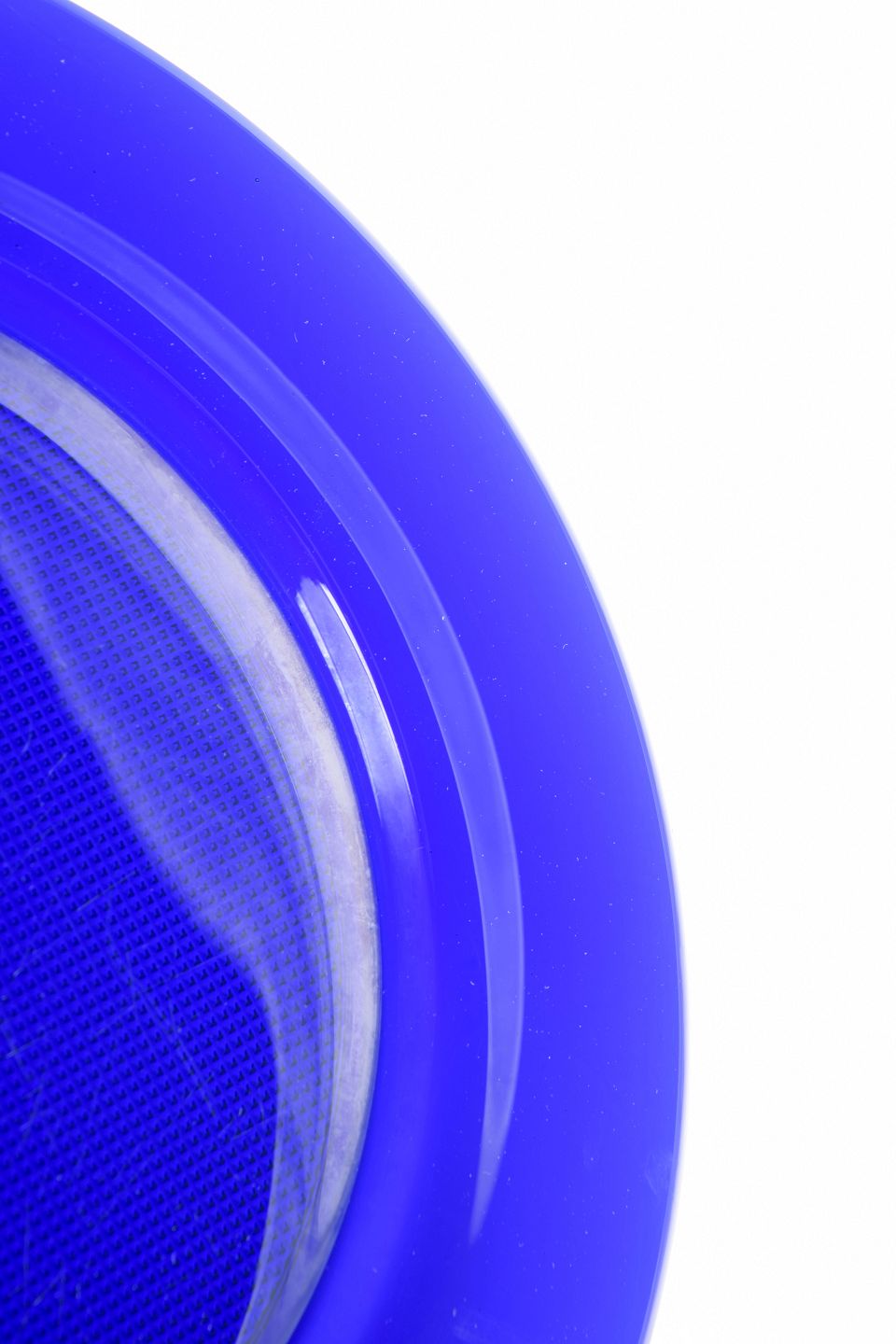 Sæt på fem dybblå dæk­tallerkener i tykt, transparent kunstglas. Den klare, mættede koboltblå farve og den enkle runde form giver et elegant og tidstypisk udtryk, typisk for skandinavisk glasdesign fra 1980’erne.