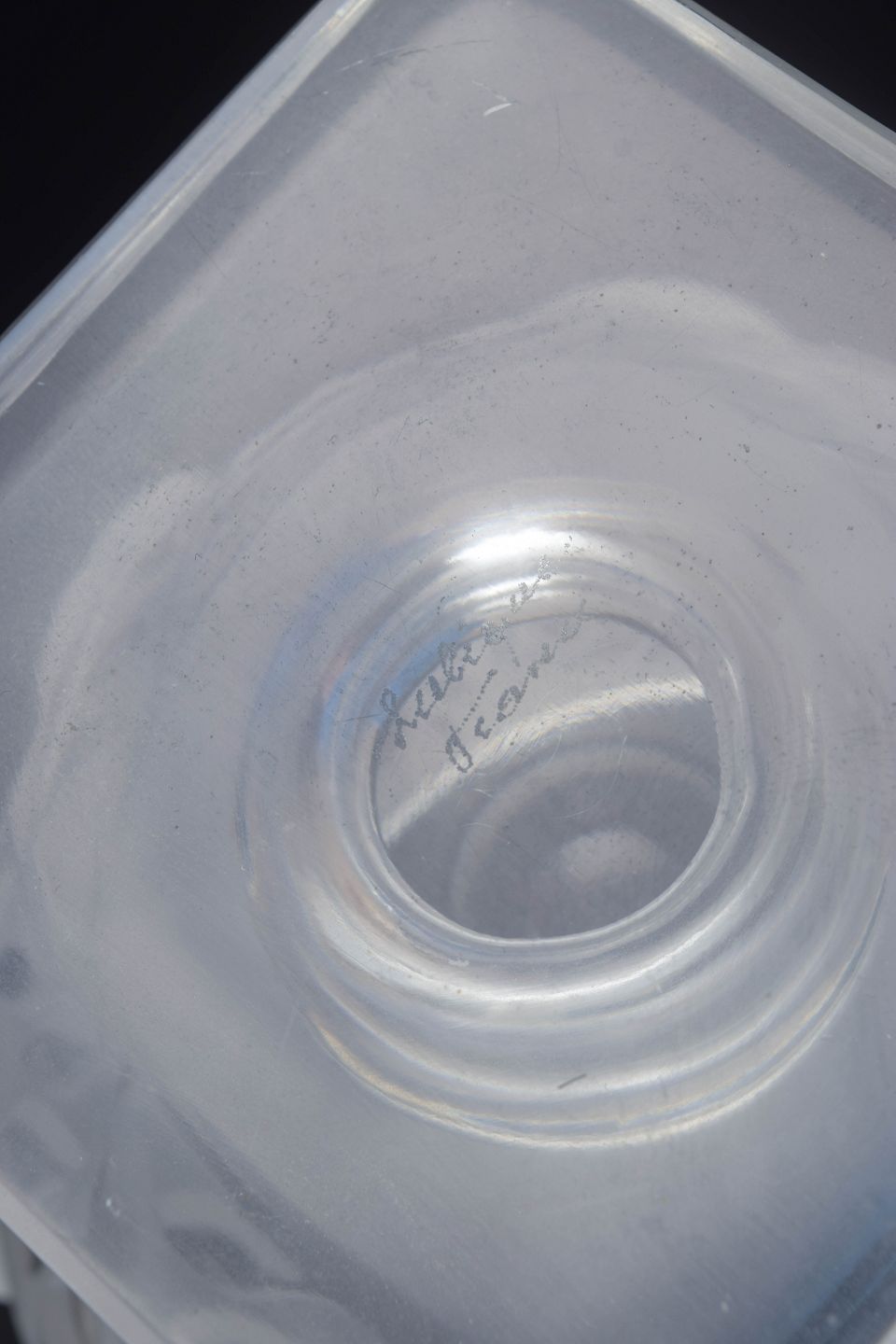 Frostet krystalglas vase på fod med firkantet base, rigt dekoreret med relief af blade og frugter i klassisk Lalique-stil. Den matte overflade kombineret med klare detaljer giver et elegant, skulpturelt udtryk.