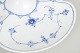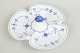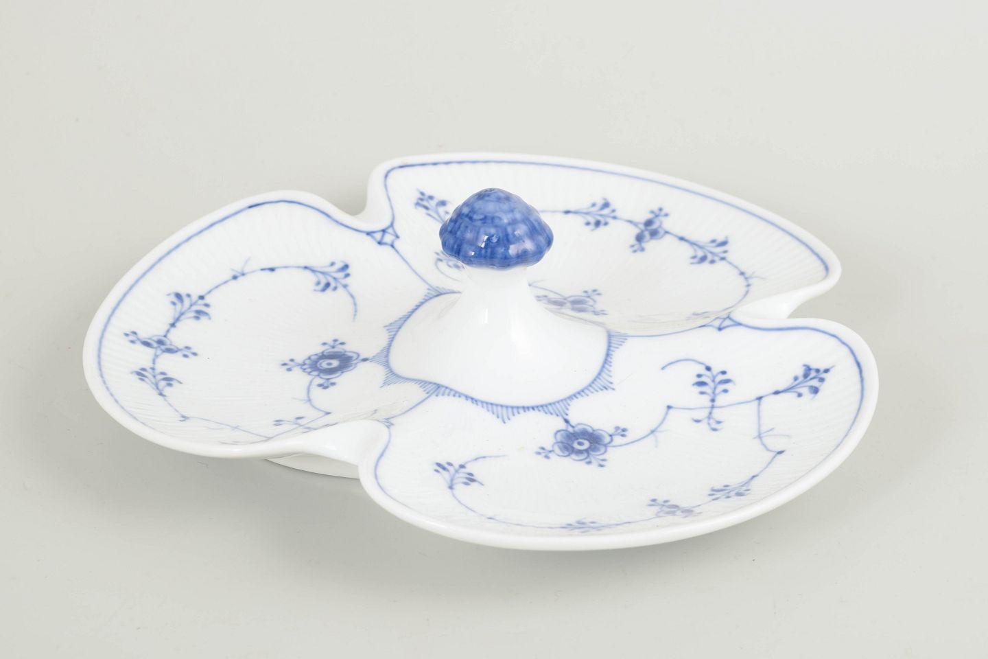 Sjældent cabaretfad i Musselmalet riflet, udført i den klassiske riflede form uden blondekant og dekoreret med håndmalet koboltblå underglasur. Fadet er opdelt i tre serveringsfelter med central knop, velegnet til små serveringer, snacks eller konfekt. En usædvanlig og dekorativ model fra mellemkrigstiden.