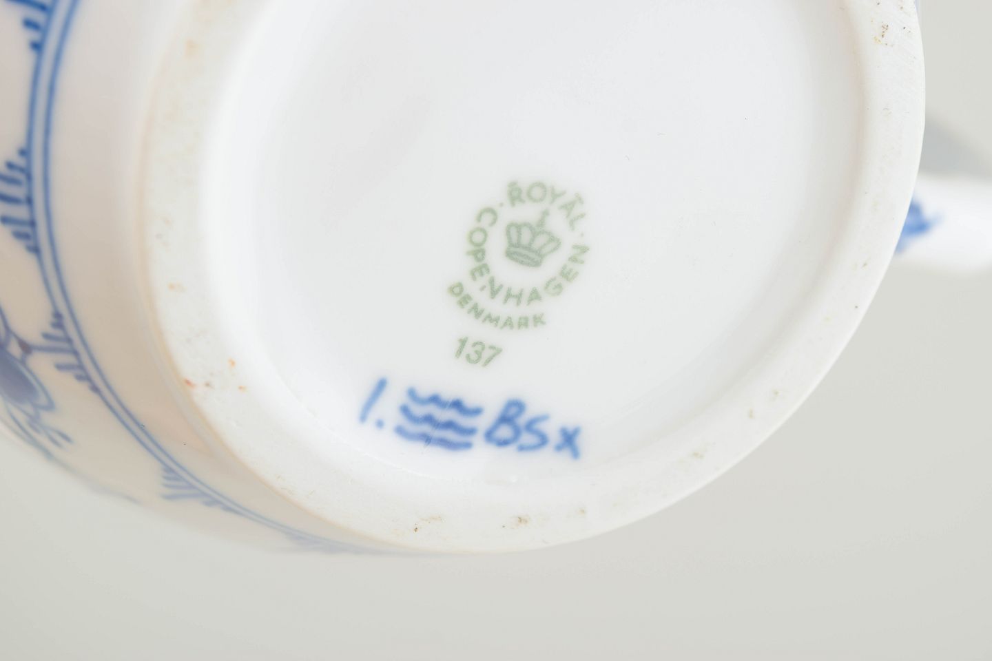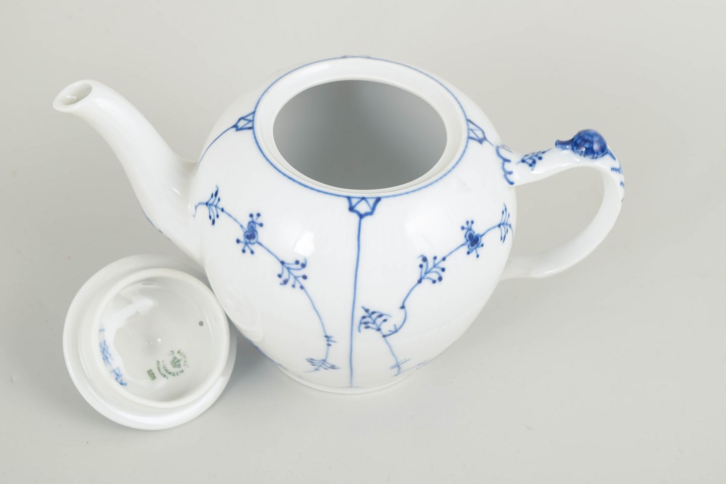 Klassisk tekande i Musselmalet, riflet, udført i den traditionelle riflede form uden blondekant og dekoreret med håndmalet koboltblå underglasur. Den harmoniske og velafbalancerede form med elegant tud samt låg med knop gør kanden velegnet til både daglig brug og samling.