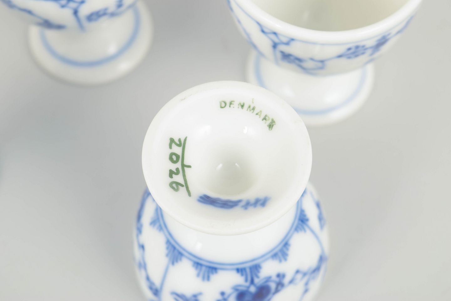 Sæt bestående af fire klassiske æggebægre i Musselmalet Riflet, udført i riflet form med fod og dekoreret med håndmalet koboltblå underglasur. Æggebægrene har en elegant og tidstypisk proportionering og repræsenterer tidlig 1900-tals bordkultur.