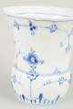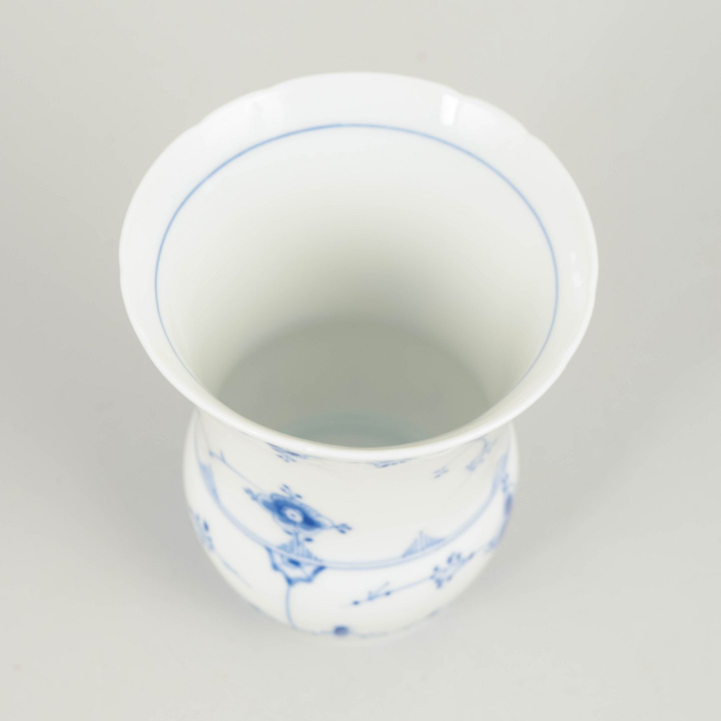 Elegant vase i Musselmalet dekoration med håndmalet koboltblåt blomstermotiv og fine ranker på hvid porcelænsbund. Formen er let svajet med markeret midterzone og klassisk balance, karakteristisk for Bing & Grøndahls produktion i mellemkrigstiden.