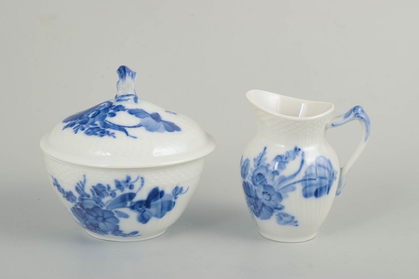Royal Copenhagen, blå blomst flettet sukkerskål og flødekande.