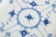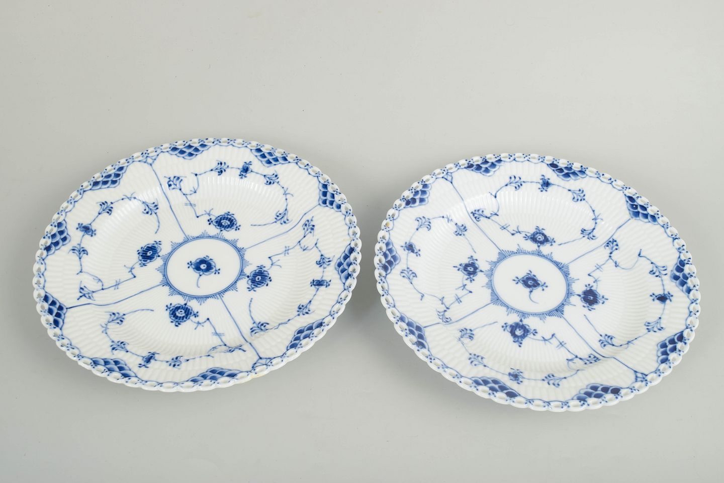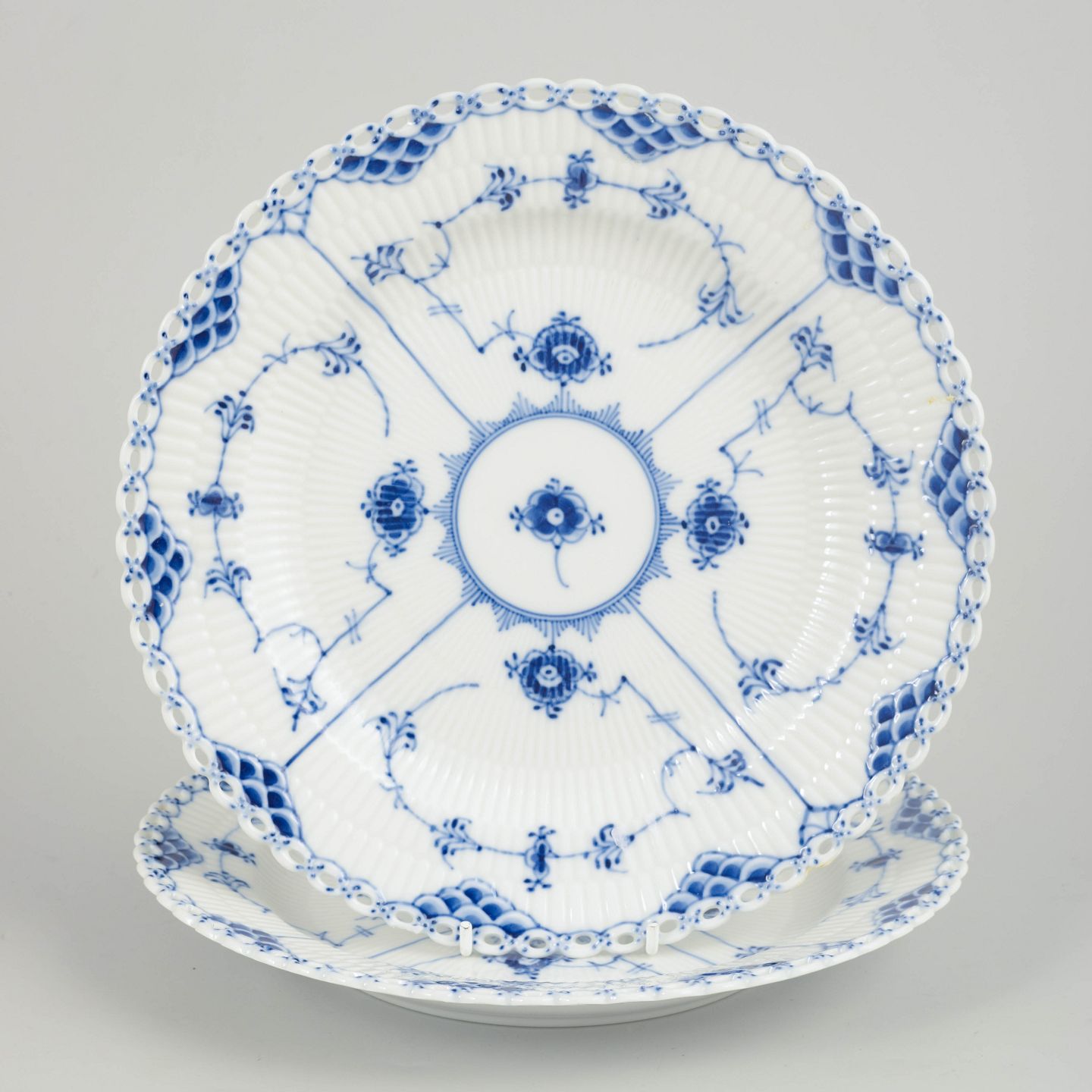 Sæt bestående af to tallerkener i glaseret porcelæn med håndmalet underglasurdekoration i det klassiske musselmalede helblonde mønster, kendetegnet ved den gennembrudte blondekant.