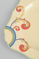 Art deco-fad i fajance med håndmalet dekoration i “Syren”-serien. Fadet har let firkantet form med blødt bølget kant og et levende, stiliseret blomstermotiv i klare, kontrasterende farver, karakteristisk for Clarice Cliffs dekorative formsprog.