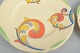Art deco-kagetallerkener i fajance med farverig, håndmalet dekoration i “Syren”-serien. Tallerkenerne har rund form med let fane og et levende, stiliseret blomstermotiv i klare, tidstypiske farver, karakteristisk for Clarice Cliffs produktion i mellemkrigstiden.