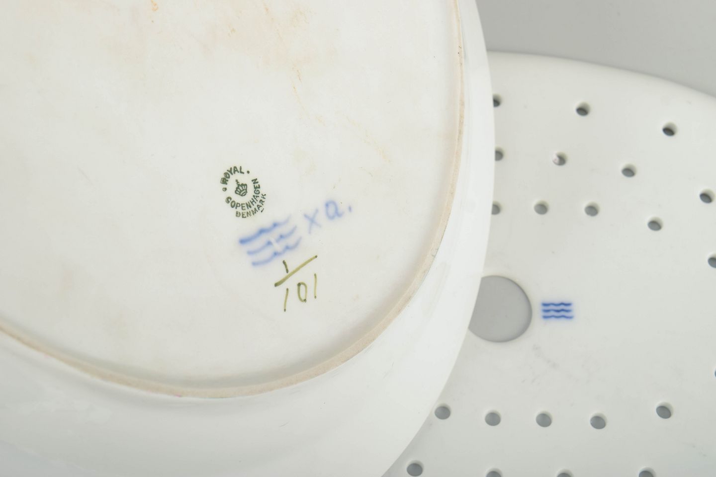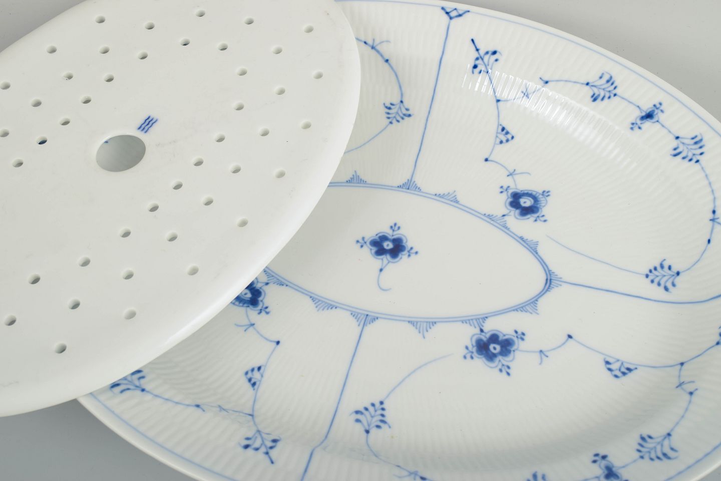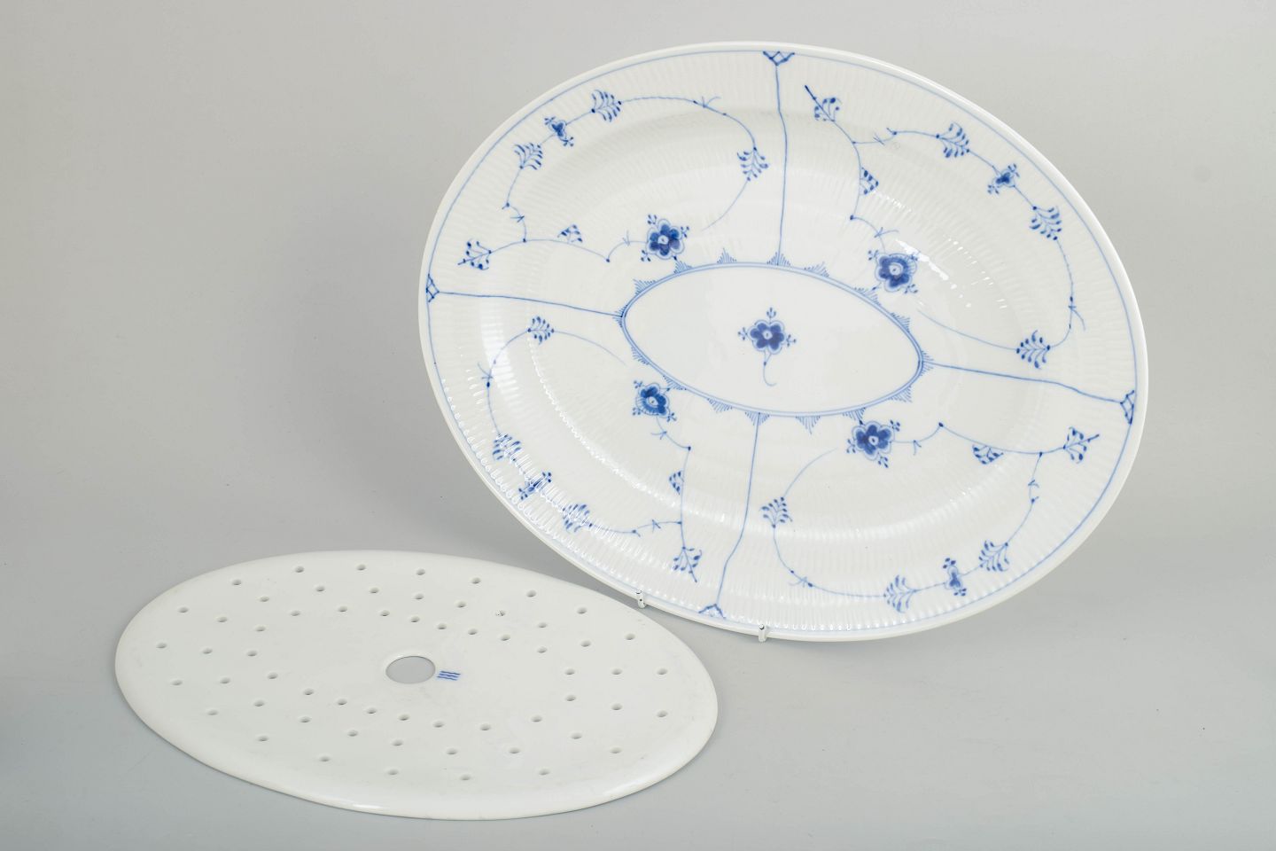 Royal Copenhagen, Musselmalet riflet fiskefad med tilhørende fiskerist.