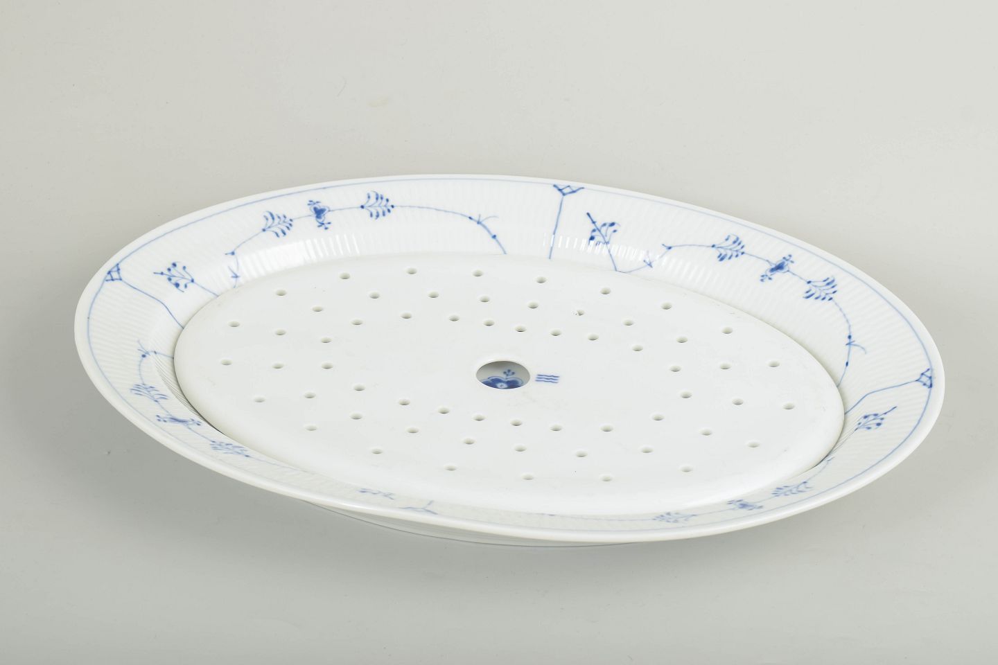 Fiskefad i porcelæn dekoreret i Musselmalet riflet med håndmalet underglasurblå blomster og ranker. Sættet består af en gennemhullet indsats og et tilhørende rundt fad, udført efter Royal Copenhagens model 1/101.