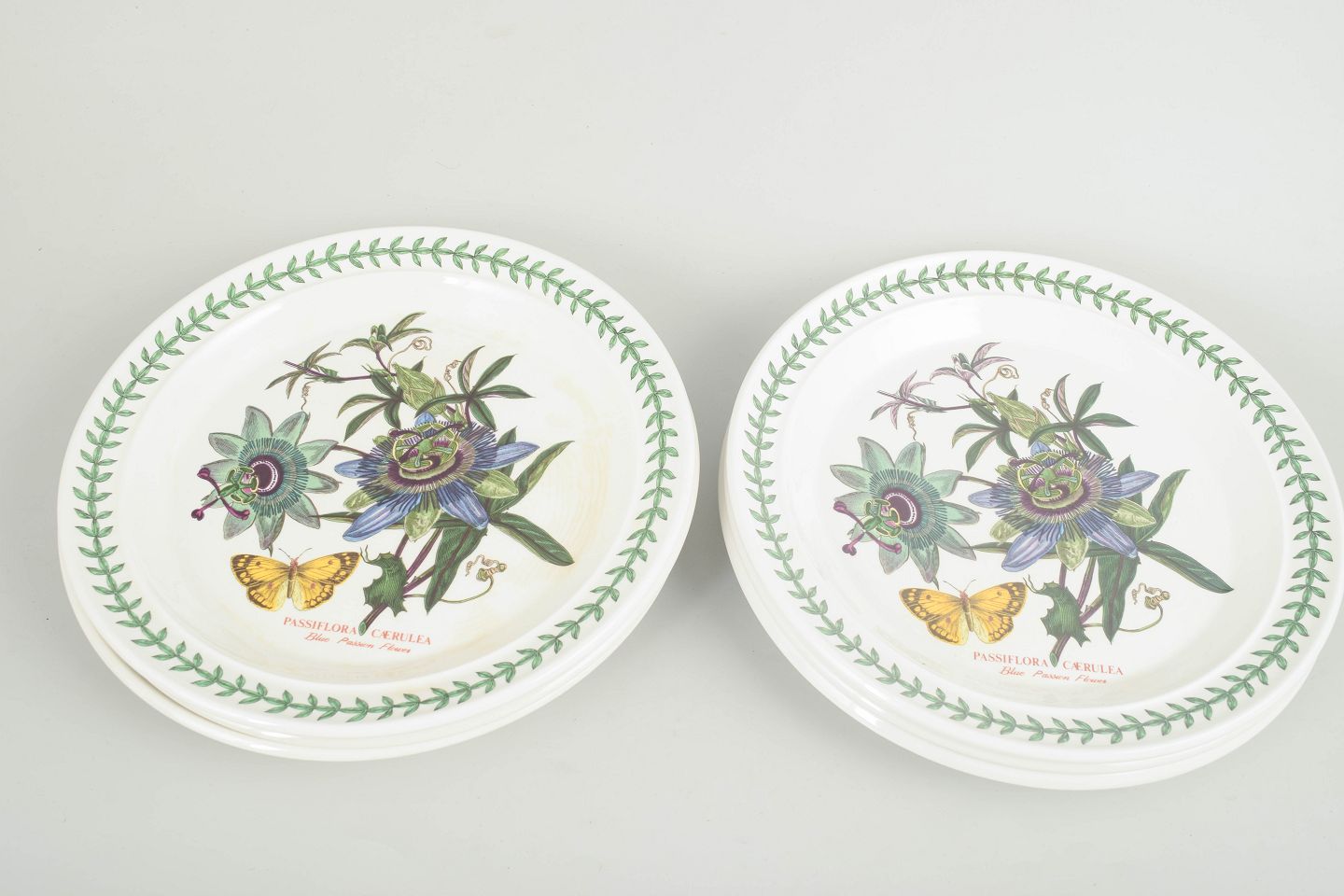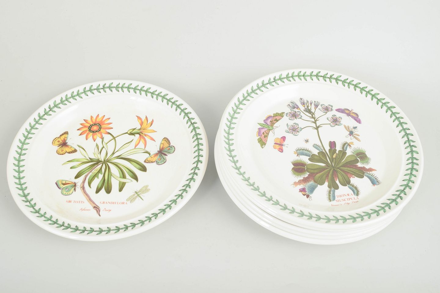 Sæt med 6 store middagstallerkener i fajance fra Portmeirion, dekoreret i “The Botanic Garden” serien med botanisk motiv og karakteristisk grøn bladbort.