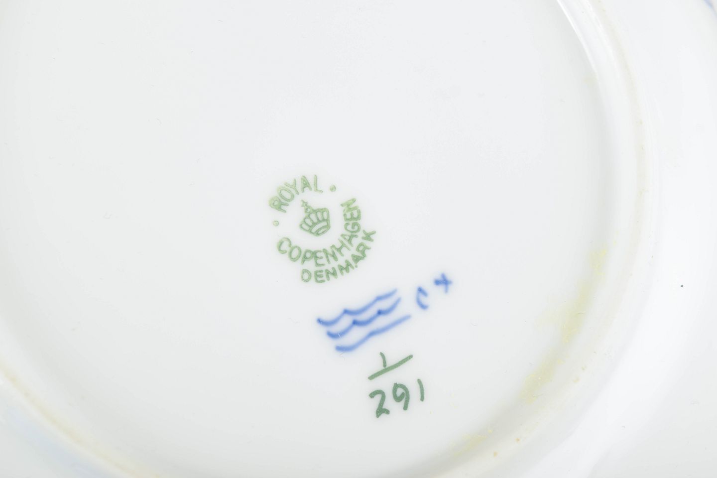 Skål dekoreret med håndmalet koboltblåt underglasur i det klassiske Musselmalet Riflet mønster. Modellen er 1/291 og kendetegnes ved den bløde, let skrånende form med opdelt spejl og fine blomster- og rankemotiver, typisk for Royal Copenhagens produktion i begyndelsen af det 20. århundrede.
