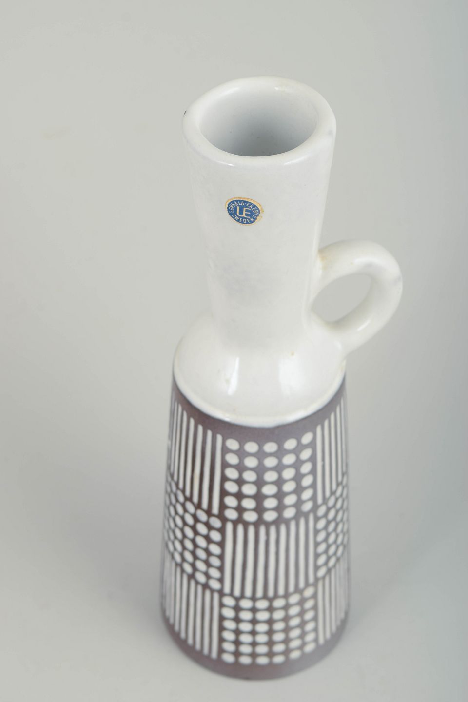 Høj, slank kande i glaseret keramik med smal hals og enkelt hank. Underdelen er dekoreret med et stramt, grafisk mønster af prikker og lodrette linjer i hvid mod brun bundglasur, mens overdelen er udført i hvid glasur. Det rytmiske dekorationsfelt giver kanden et klart modernistisk udtryk. Modelnummer 4564.