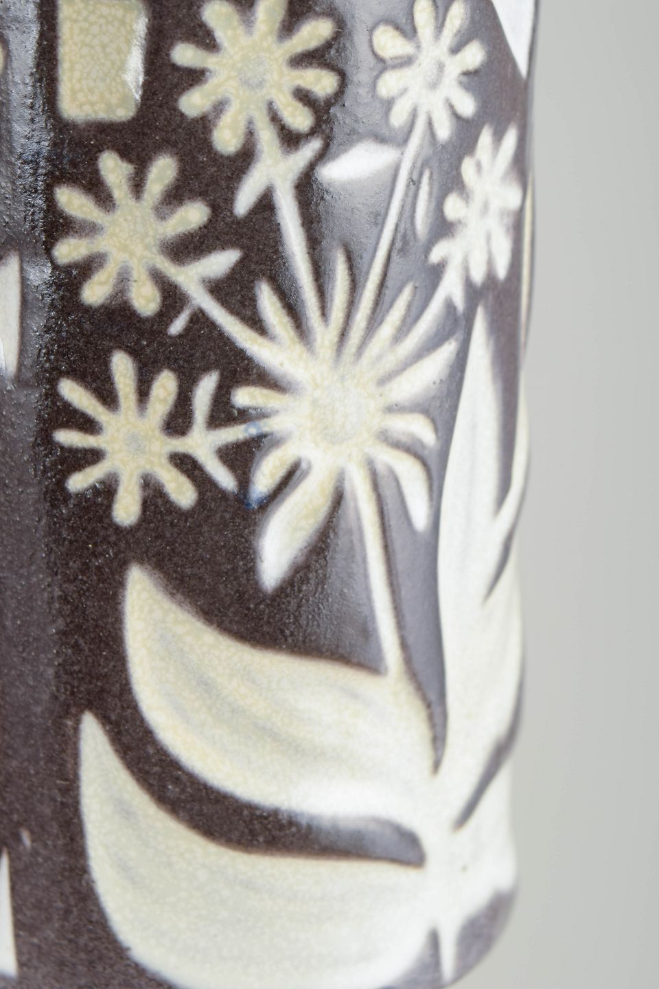 Cylinderformet vase i glaseret keramik med smal hals og grafisk dekoration i creme- og brunlige toner mod hvid bundglasur. Dekoren består af stiliserede bladmønstre og ornamentale elementer i et tydeligt modernistisk formsprog. Modelnummer 4330/683.