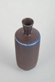 Miniature vase i stentøj med cylindrisk korpus og smal hals, udført som studiokeramik (studio hand). Glasuren er dyb brun med diskrete levende nuancer og en markant blålig overgang ved skulderen samt ringfod.