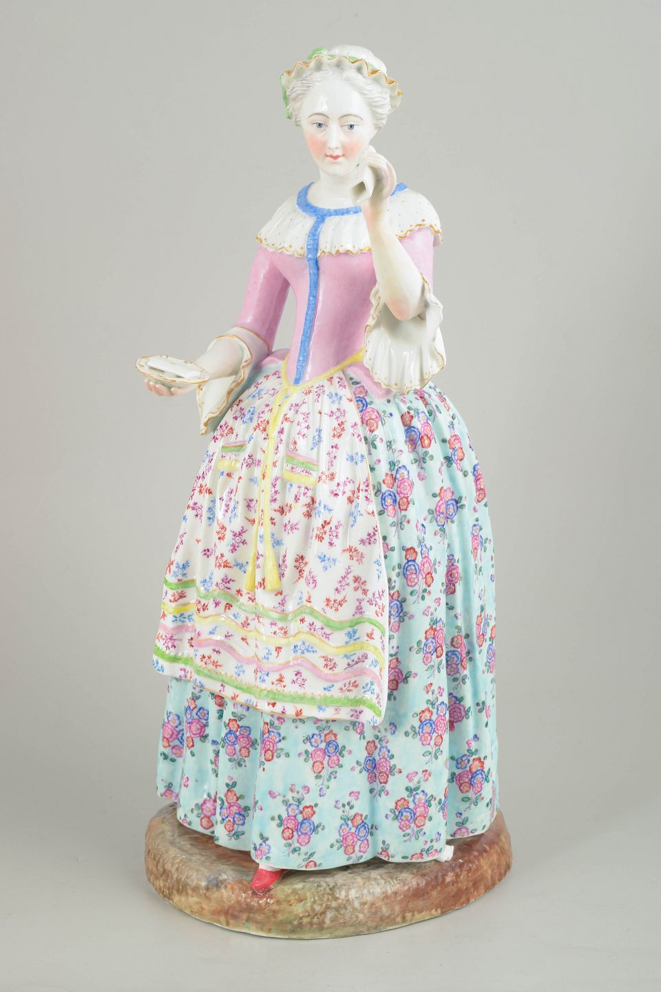 Stor Meissen porcelænsfigur fremstillet efter Jean-Étienne Liotards berømte motiv “La Belle Chocolatière” (1744). Figuren forestiller en kvinde i 1700-talsdragt med serveringsbakke og kop, rigt bemalet med polykrome blomsterdekorationer, fine ansigtstræk og detaljeret staffering. Udført efter model nr. 1471 og forsynet med Marcolini-mærke, dateret til ca. 1790’erne.
