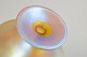 Lille fodskål i iriserende kunstglas, model nævnt i beskrivelsen, med let udsvajet kumme og lav fod; den perlemorsskinnende overflade giver et levende farvespil, karakteristisk for periodens dekorative glas.