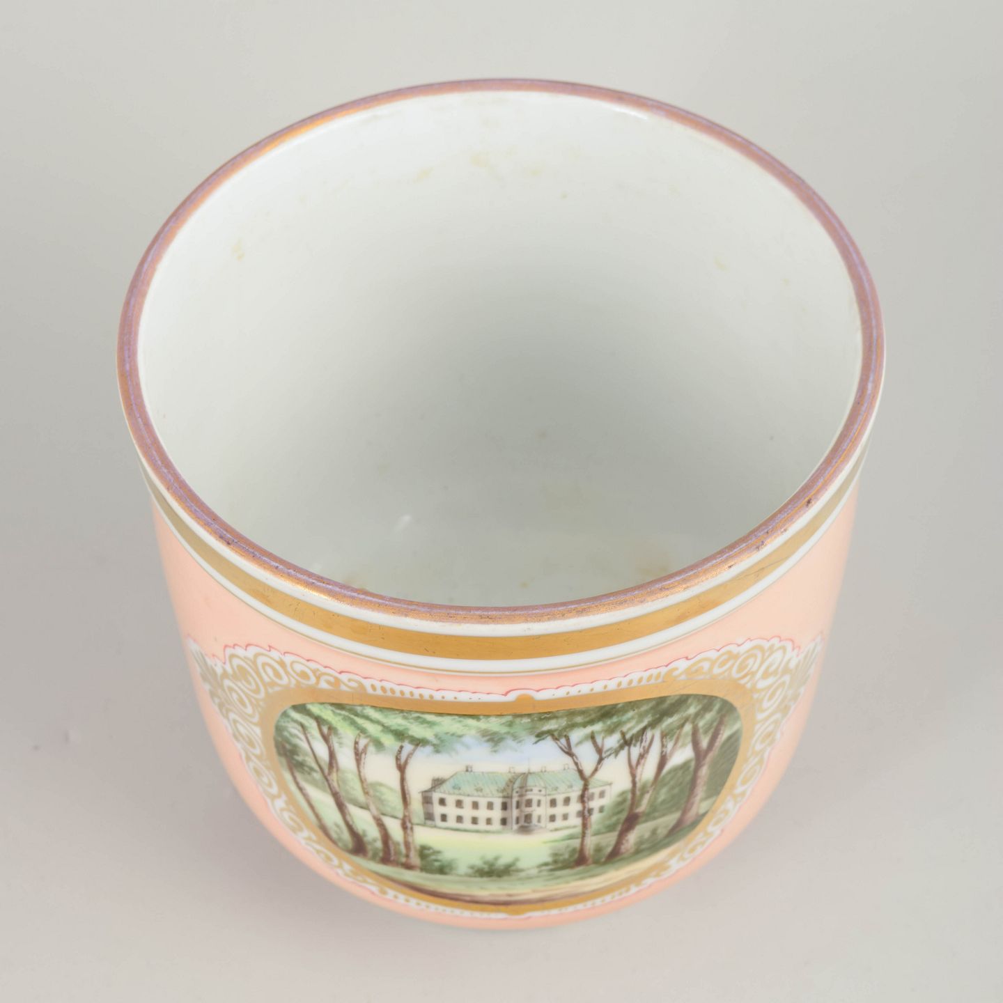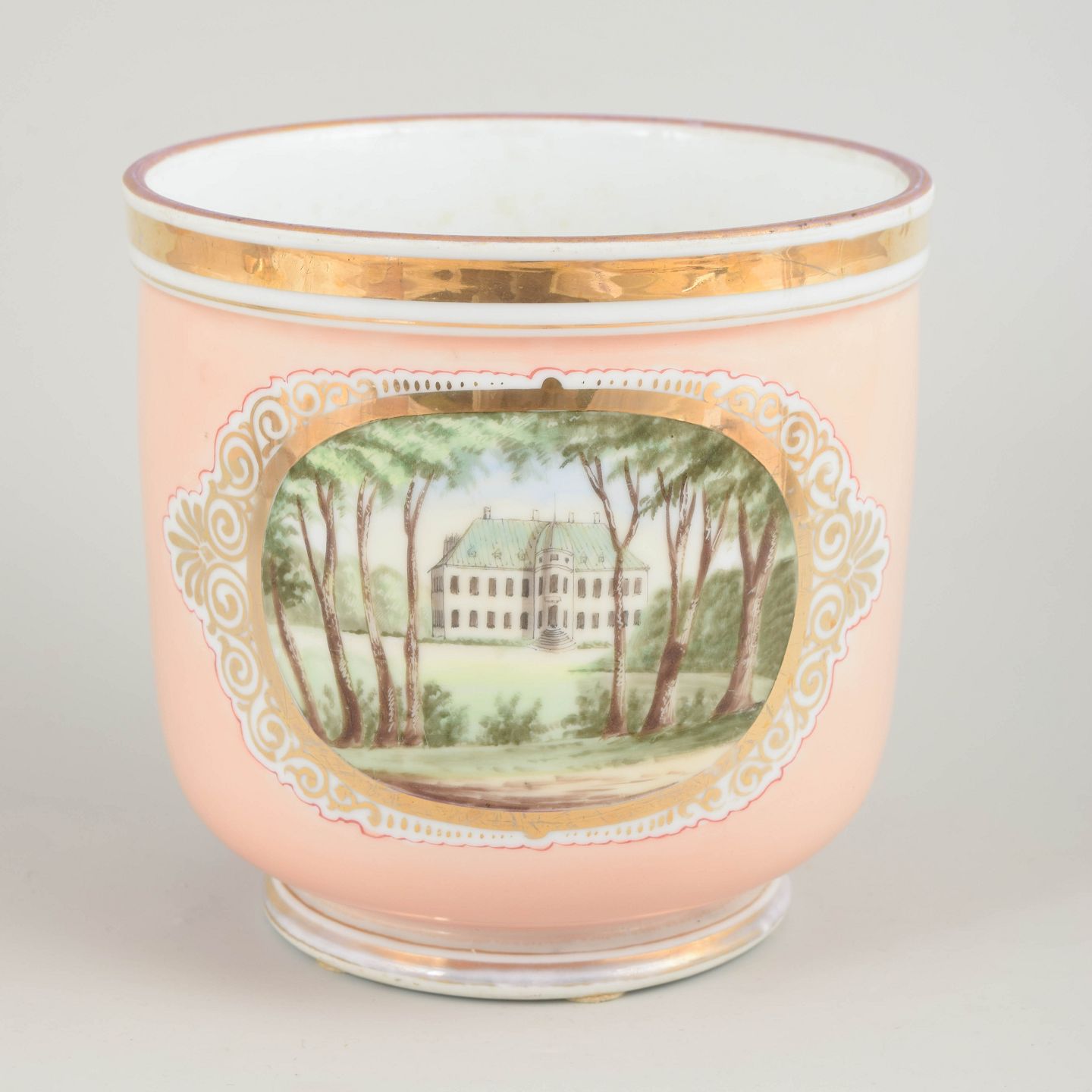 Rund, let konisk vase i porcelæn med opaliserende rosa bundfarve og håndmalet prospekt af Bernstorff Slot og Kronborg slot i parklandskab med høje træer i forgrunden, indrammet af et ornamenteret felt og forgyldt bort langs randen. Klassicistisk inspireret form med lav fodring. Motivet er udført i bløde grønne og jordfarver med let idealiseret arkitektonisk gengivelse.