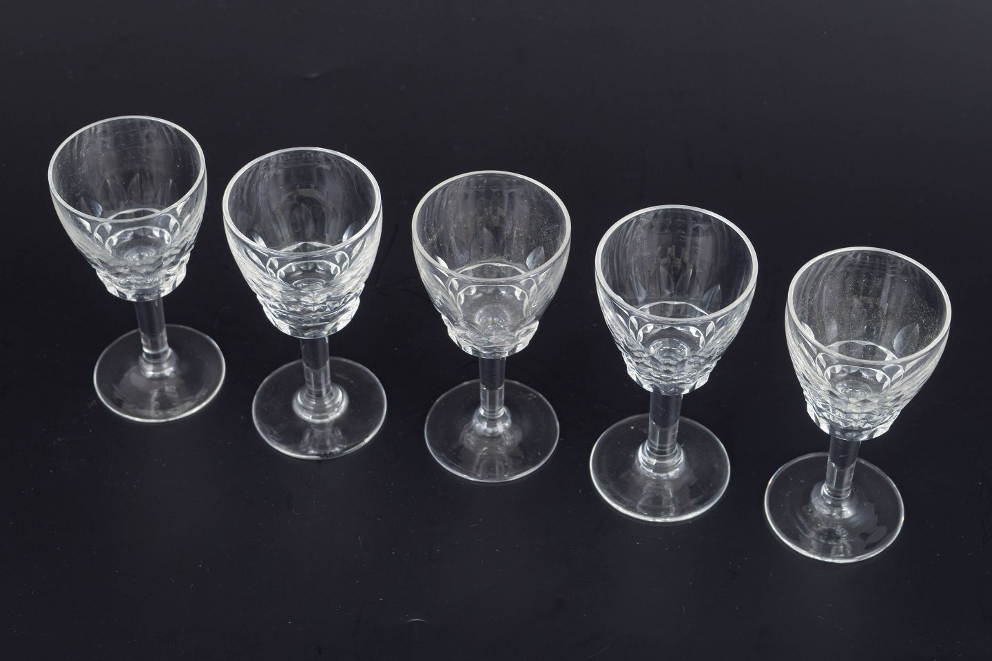Sæt på fem franske snapseglas i klart krystal med facetteret kumme og klassisk stamme. Form og slibning giver et elegant lysspil og et tidstypisk udtryk fra midten af det 20. århundrede.