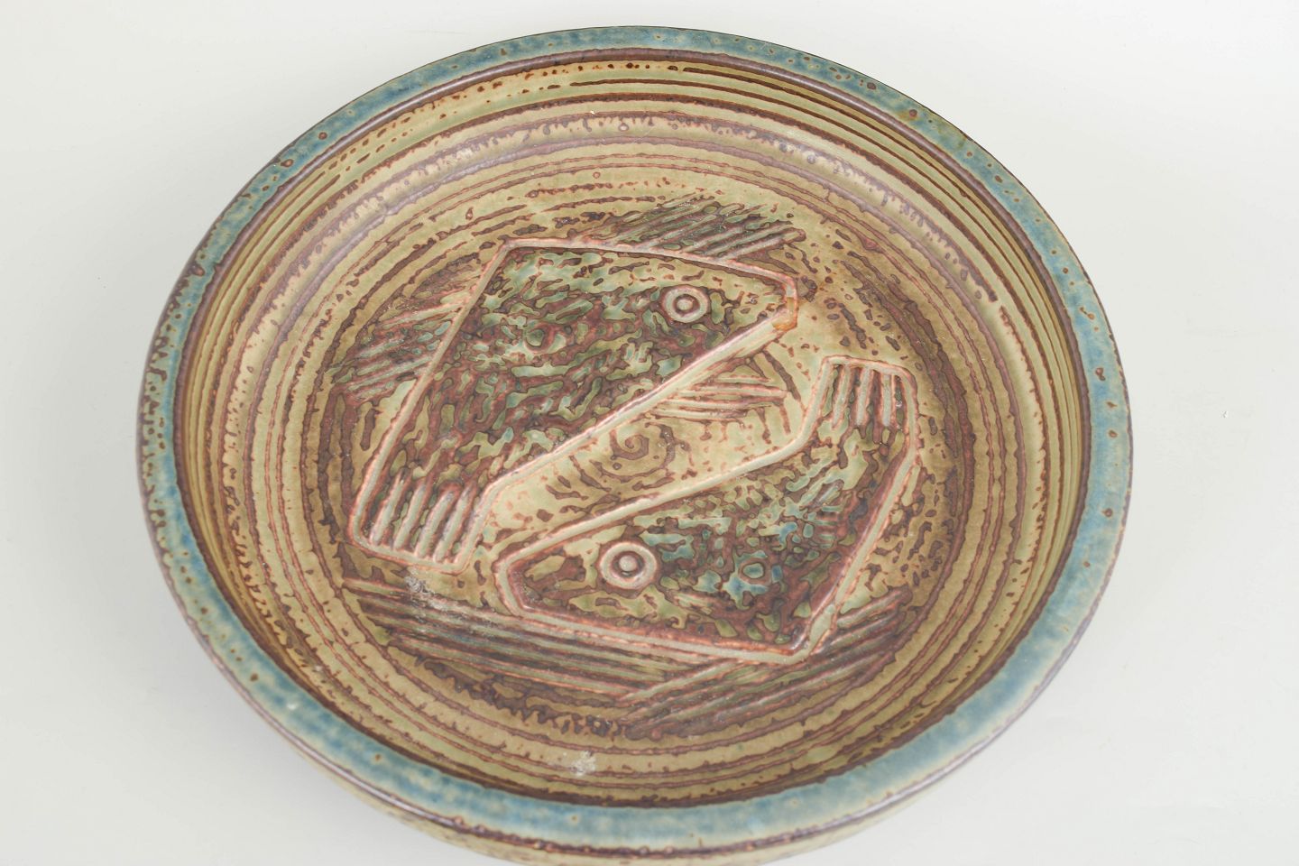 Large circular stoneware dish with glazed surface and a central stylised fish motif in earthy tones, combined with contrasting glaze bands. Model 21937.