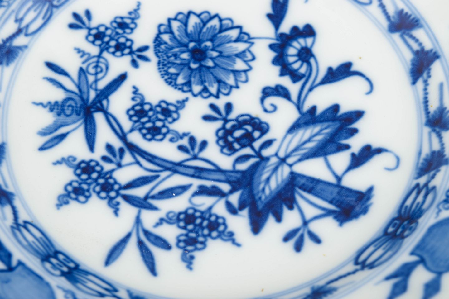 Meissens løgmønster blev introduceret i 1739 og er inspireret af østasiatiske porcelænsdekorationer med stiliserede blomster- og frugtmotiver udført i underglasurblåt. Mønstret blev et af fabrikkens mest varige og genkendelige stel. Omkring år 1900 fortsatte Meissen produktionen af løgmønster i høj kvalitet, hvor middagstallerkenerne indgik som centrale elementer i borddækningen og afspejler fabrikkens høje tekniske niveau og dekorative tradition.