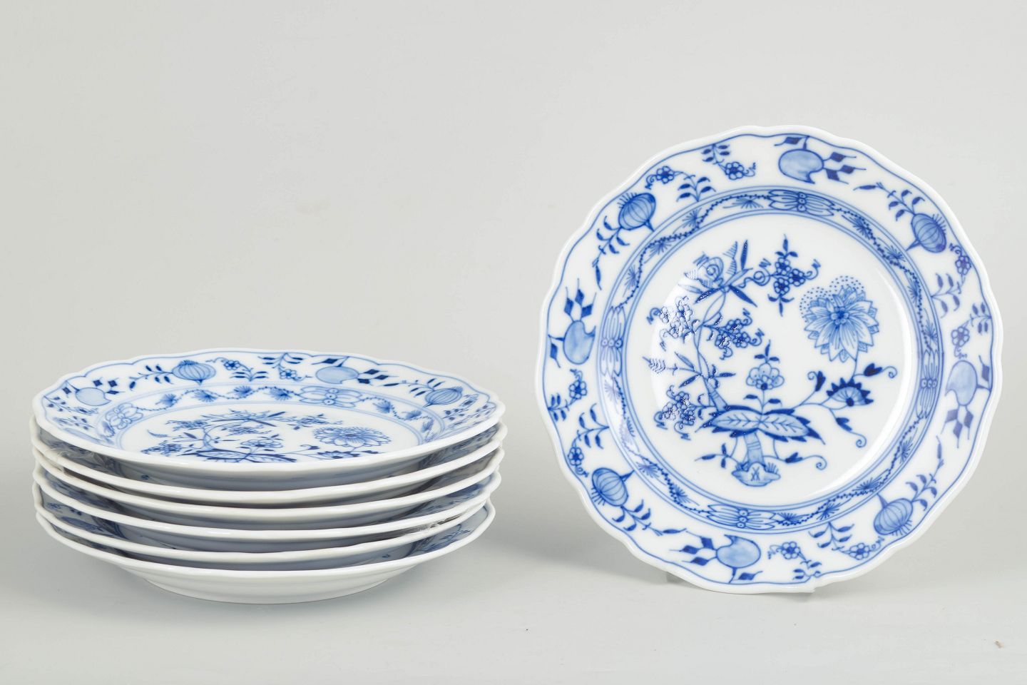 Runde tallerkener i hvidt porcelæn dekoreret i underglasurblåt løgmønster med bølget fane. Mærket i bunden med Meissens krydsede sværd. Nogle eksemplarer annulleret med to indridsede streger, andre med tre.