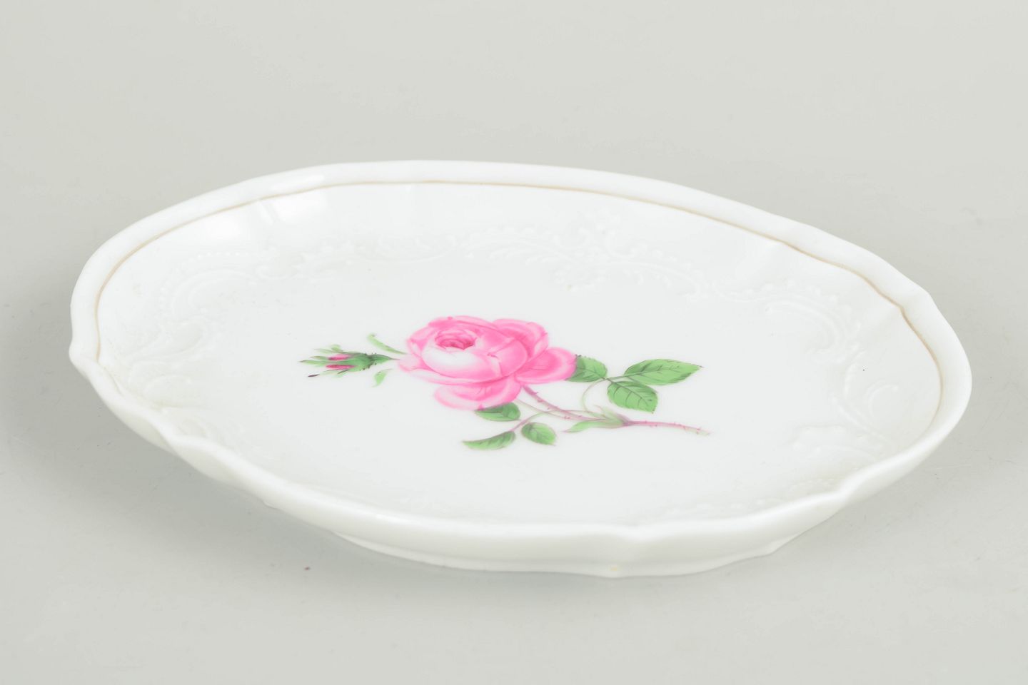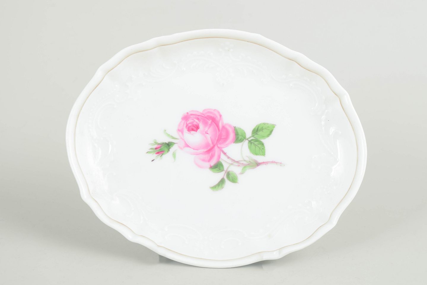 Lille ovalt fad i porcelæn dekoreret med håndmalet rosa rose i midten, omgivet af diskret reliefdekoration langs kanten. Klassisk udførelse fra Meissen med fin glasur og elegant formgivning, typisk for perioden.