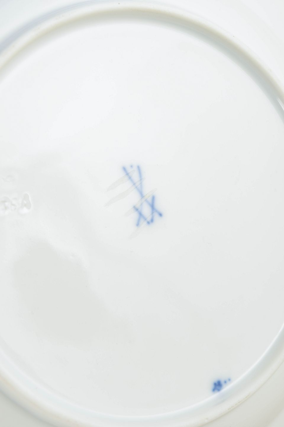 Runde porcelænstallerkener dekoreret med grøn vinløvsbort langs kanten. Nogle eksemplarer i første sortering, andre annulleret med fire indridsede streger. Mærket med Meissens krydsede sværd.