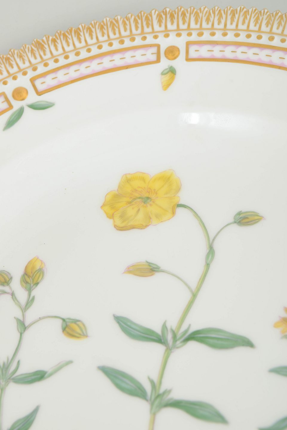 Middagstallerken i porcelæn med håndmalet botanisk motiv fra det eksklusive Flora Danica-stel, udført i naturalistiske farver og indrammet af rigt forgyldt bort.