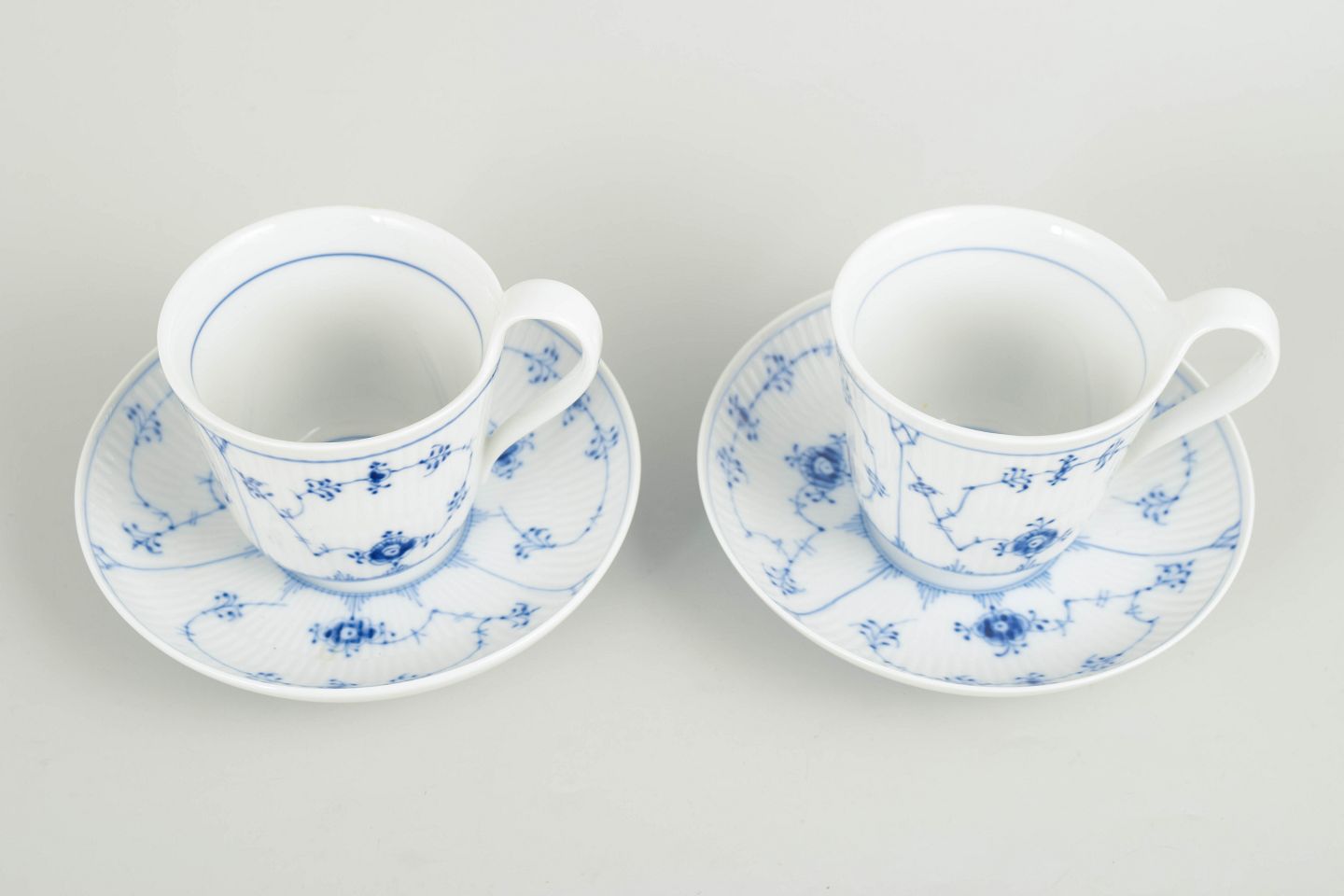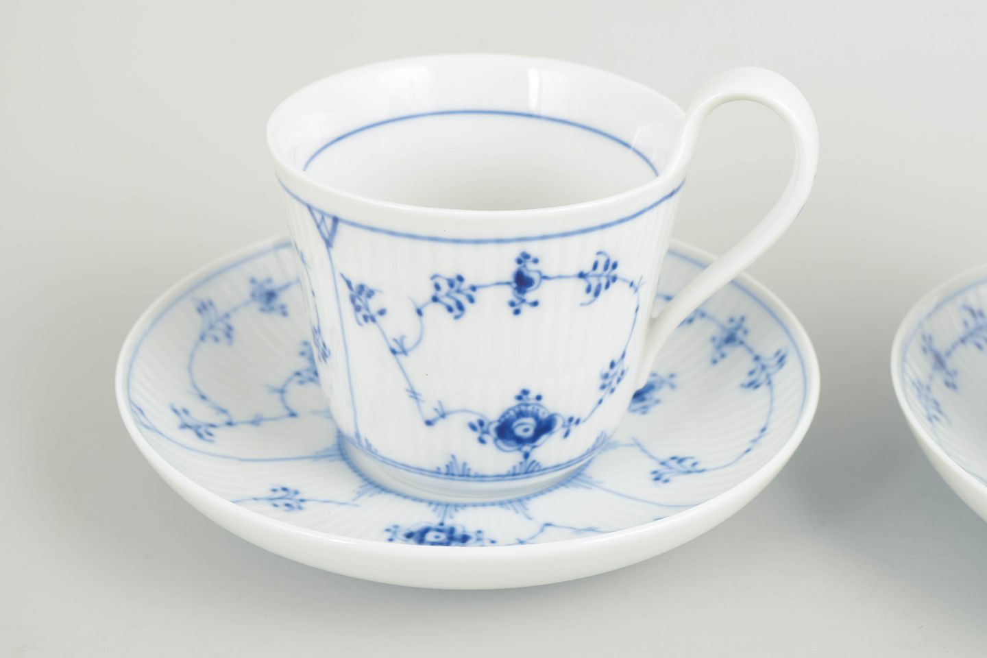 Royal Copenhagen, Musselmalet riflet store krus med matchende underkopper, sæt på 2.