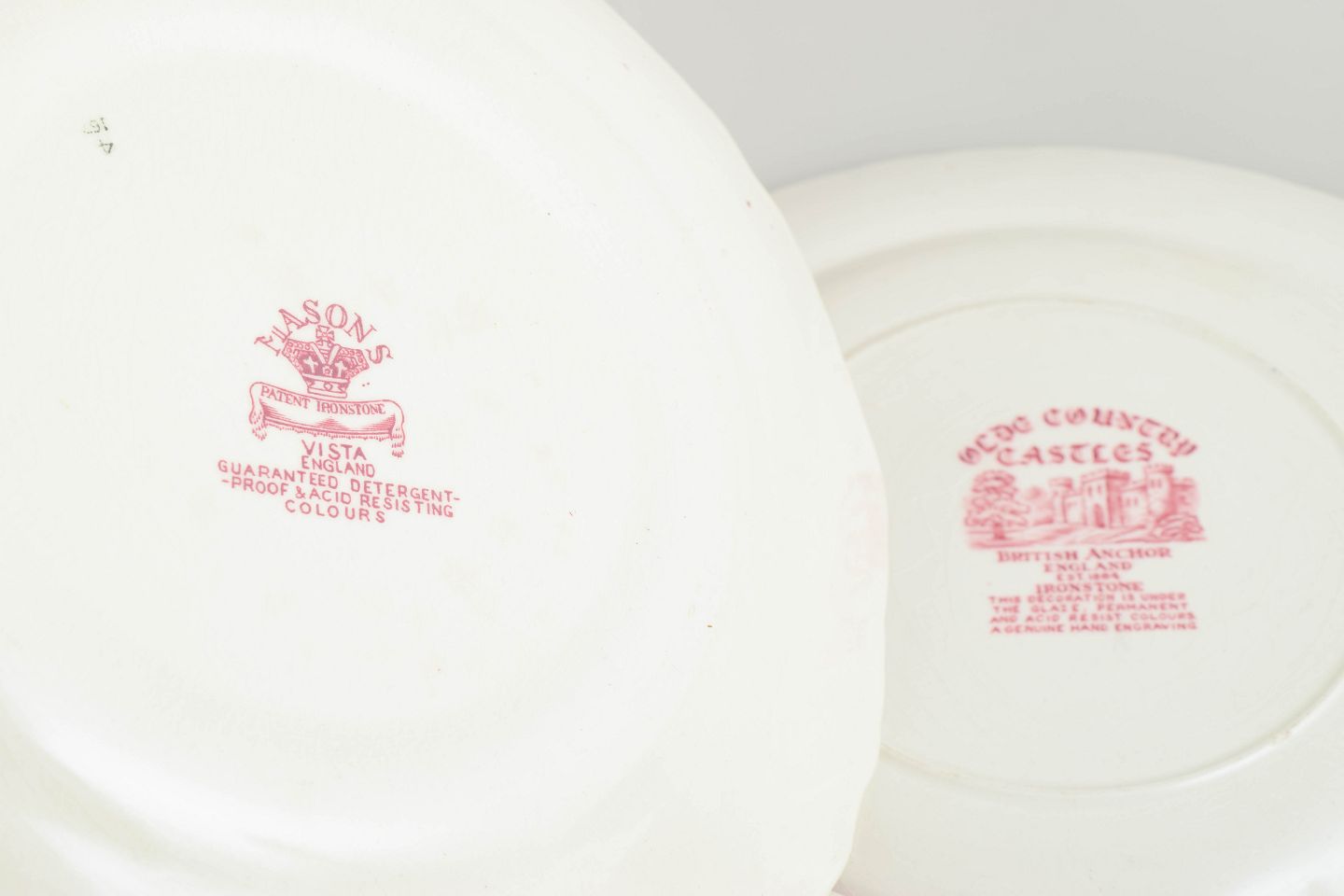 Engelsk fajanceproduktion i mellemkrigstiden var præget af en stærk tradition for transferware-dekoration, især i Staffordshire-området. Fabrikker som Mason’s, Royal Warwick og beslægtede producenter fremstillede servicevarer med detaljerede landskabs- og historiske motiver. Disse tallerkener var tiltænkt daglig brug, men er i dag eftertragtede for deres dekorative kvalitet og tydelige tidsudtryk.