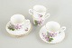 Sæt på fire kaffekopper og tilhørende underkopper i benporcelæn, dekoreret med violette blomster og grønne blade samt guldkant. Fremstillet af Royal Stafford, England.