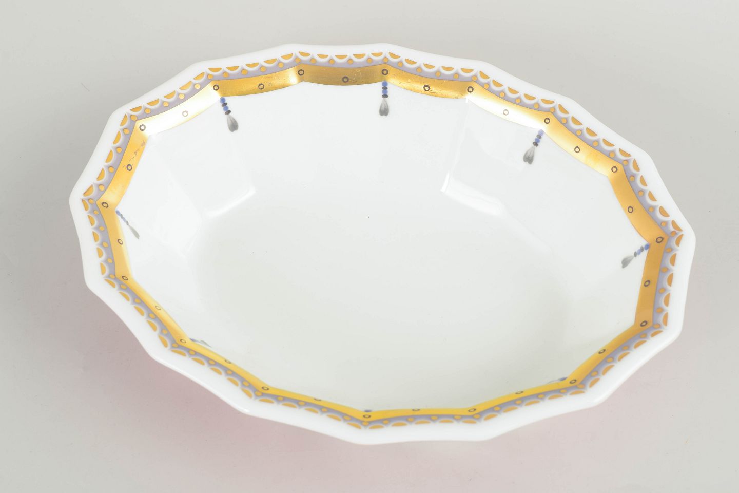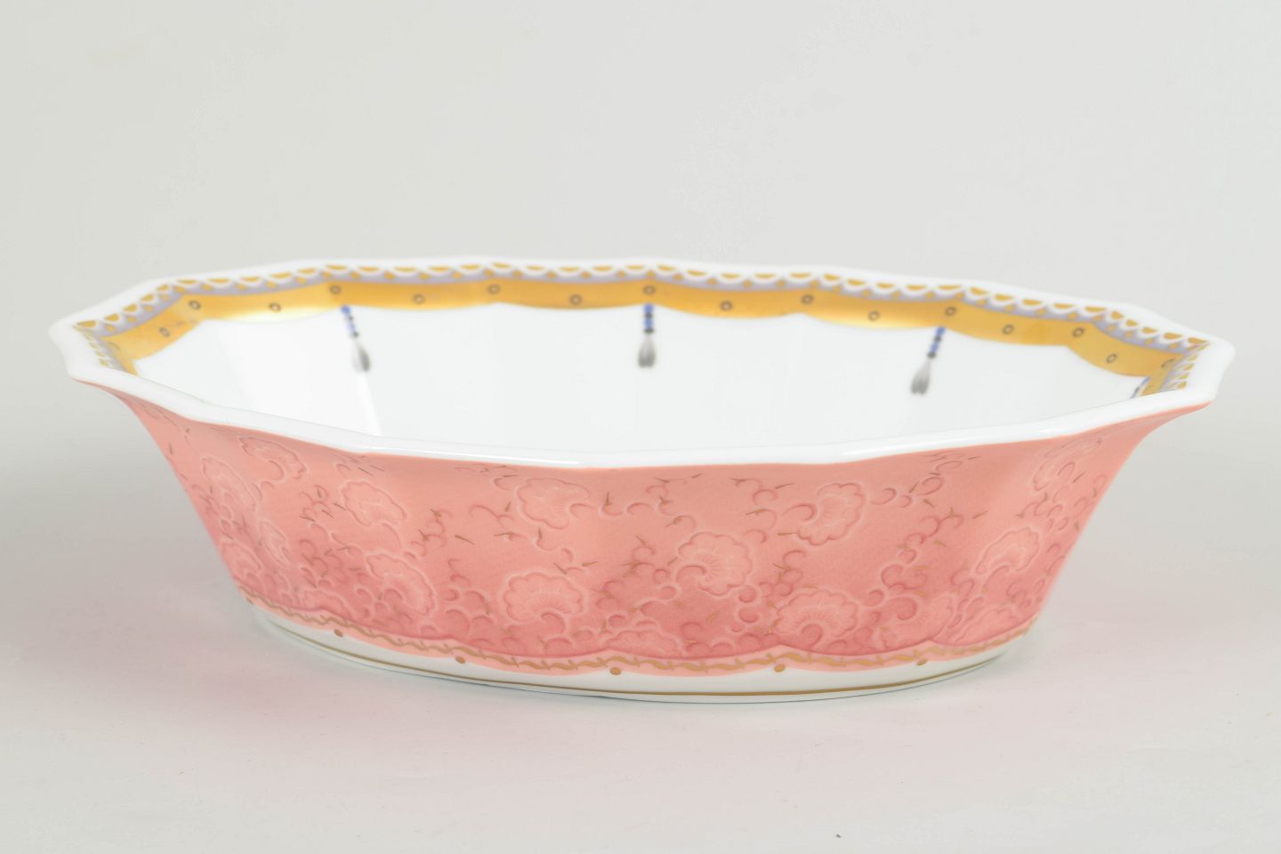 Lav skål i hvidt porcelæn dekoreret med Fairytale-mønster i bløde rosa toner med fine ornamentale detaljer. Fremstillet i perioden 1992–1999 i 1. sortering. Model 579.
