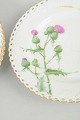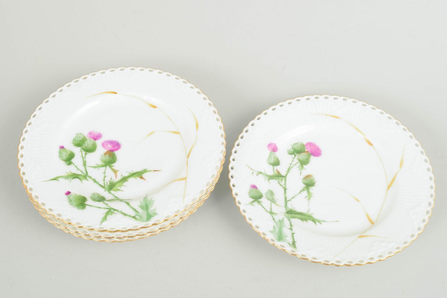Håndmalede porcelænstallerkener med gennembrudt rand og naturalistisk dekoration med tidselmotiv. Udført med fine farvenuancer og diskrete forgyldninger, karakteristisk for Royal Copenhagens produktion i det 19. århundrede.