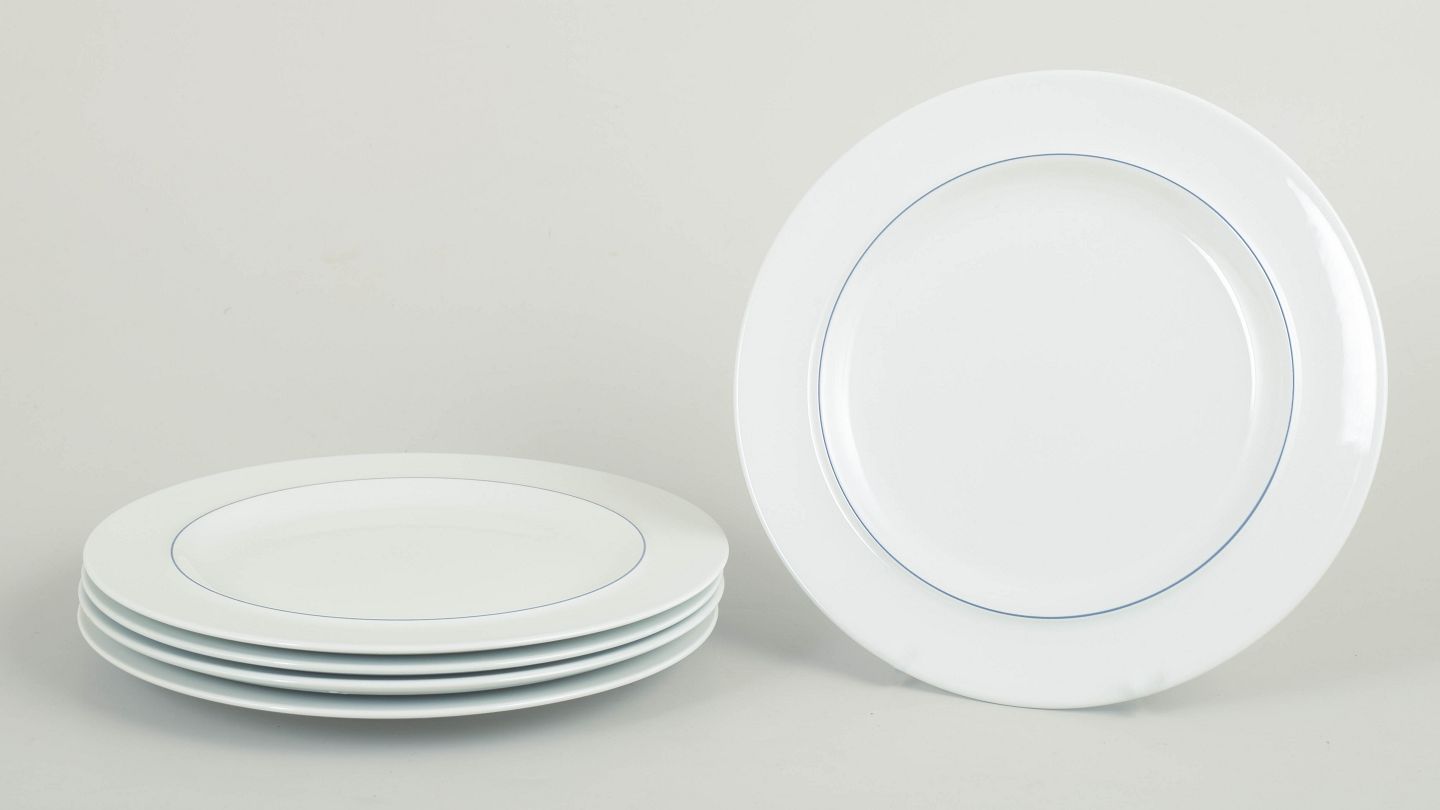 Fem runde tallerkener model 621 i hvid fajance med enkel blå rand langs fanen. En del af Blåkant-serien med sit stringente og funktionelle formsprog. Fremstillet 1992–1999. 1. sortering.