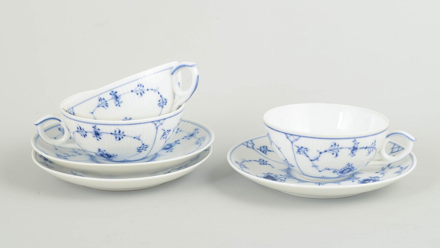 Sæt af tre tekopper i håndmalet porcelæn fra Musselmalet Riflet med klassisk underglasurdekoration i koboltblå. Model 1/76. Fremstillet i 1920’erne. Nogle dele er første sortering, andre annulleret med én eller to indridsede streger under bunden.