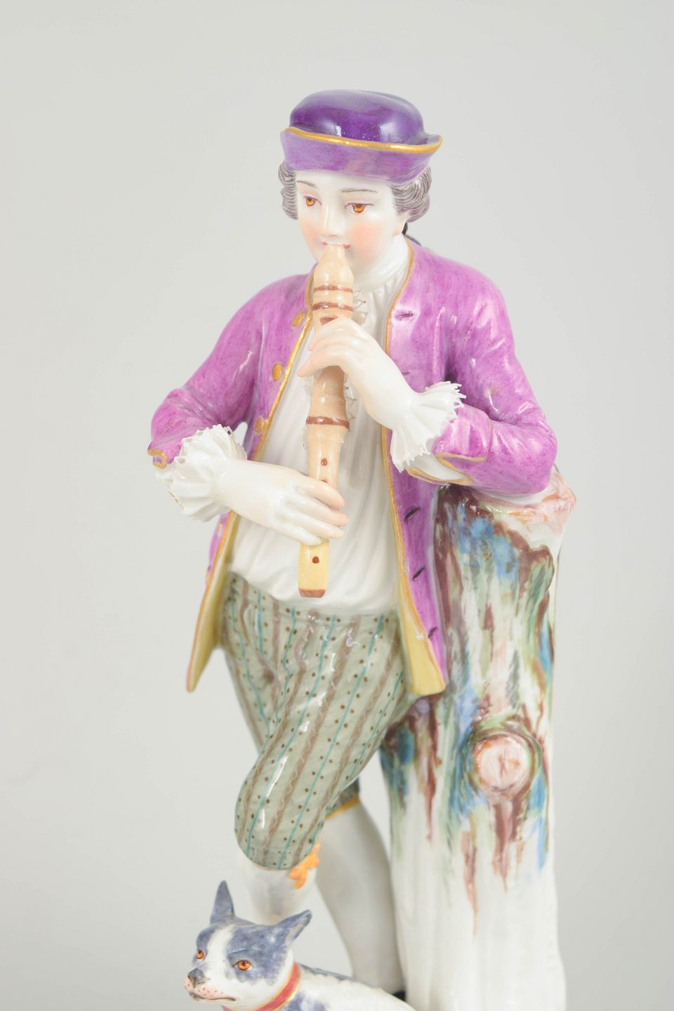 Porcelain figurine depicting a standing nobleman with a flute beside a tree stump and a small dog at his feet. Executed in hand-painted porcelain with polychrome colors and gilded details.