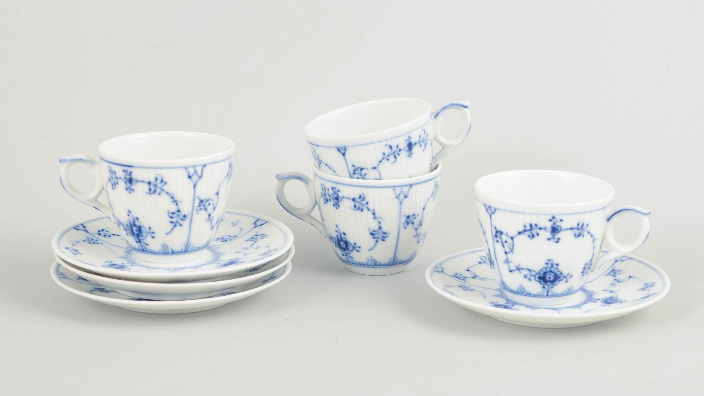Royal Copenhagen Musselmalet Riflet, sæt på fire mokka-kopper.