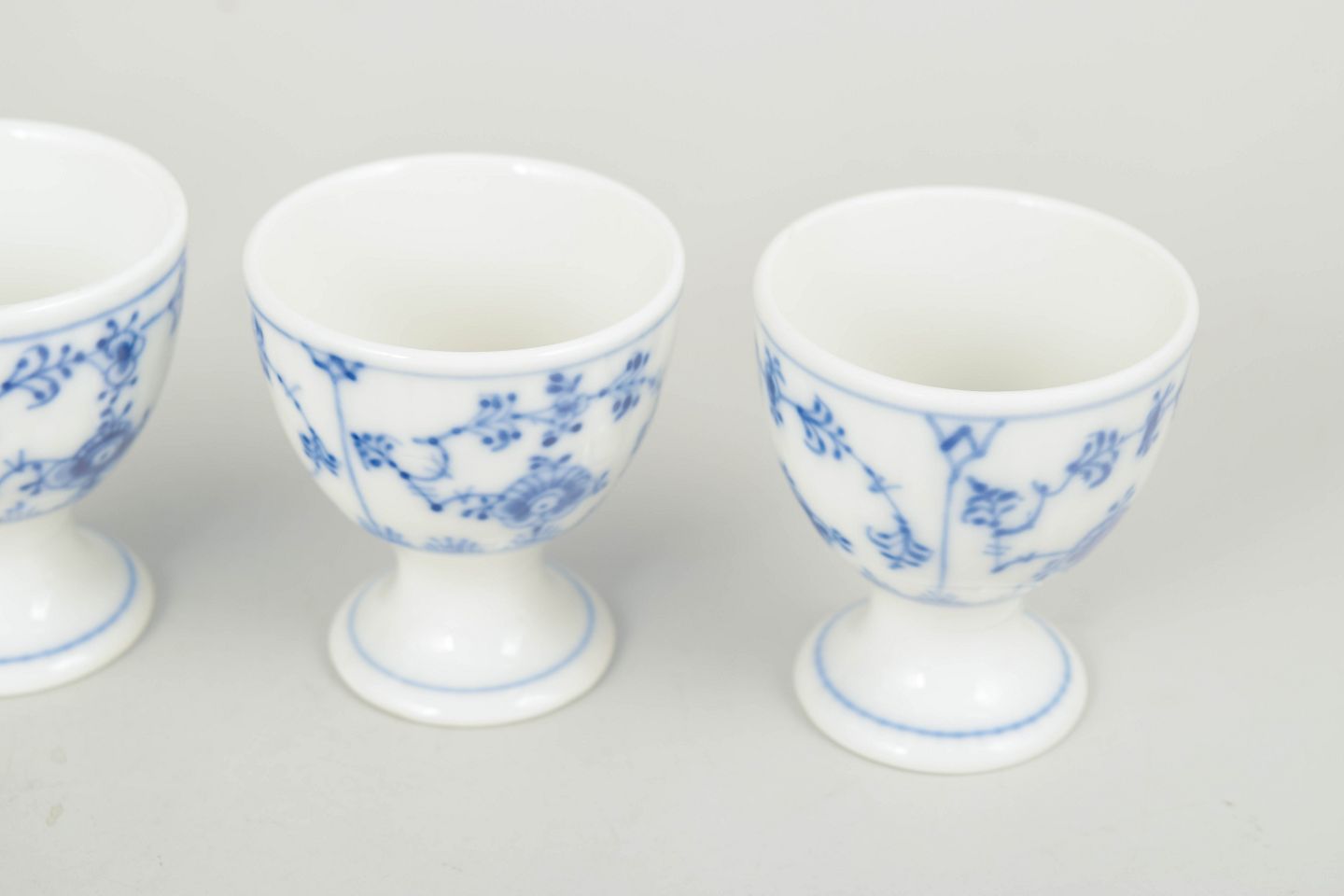 Sæt af fire håndmalede æggebægre i porcelæn dekoreret med det klassiske musselmalede riflet mønster i blå underglasur. Æggebægrene har rund skålformet overdel og lille fod, dekoreret med de karakteristiske blomsterornamenter og slyngede blomstergrene fra serien. Undersiden er fabriksstemplet Royal Copenhagen, første sortering. Model 1/2026.