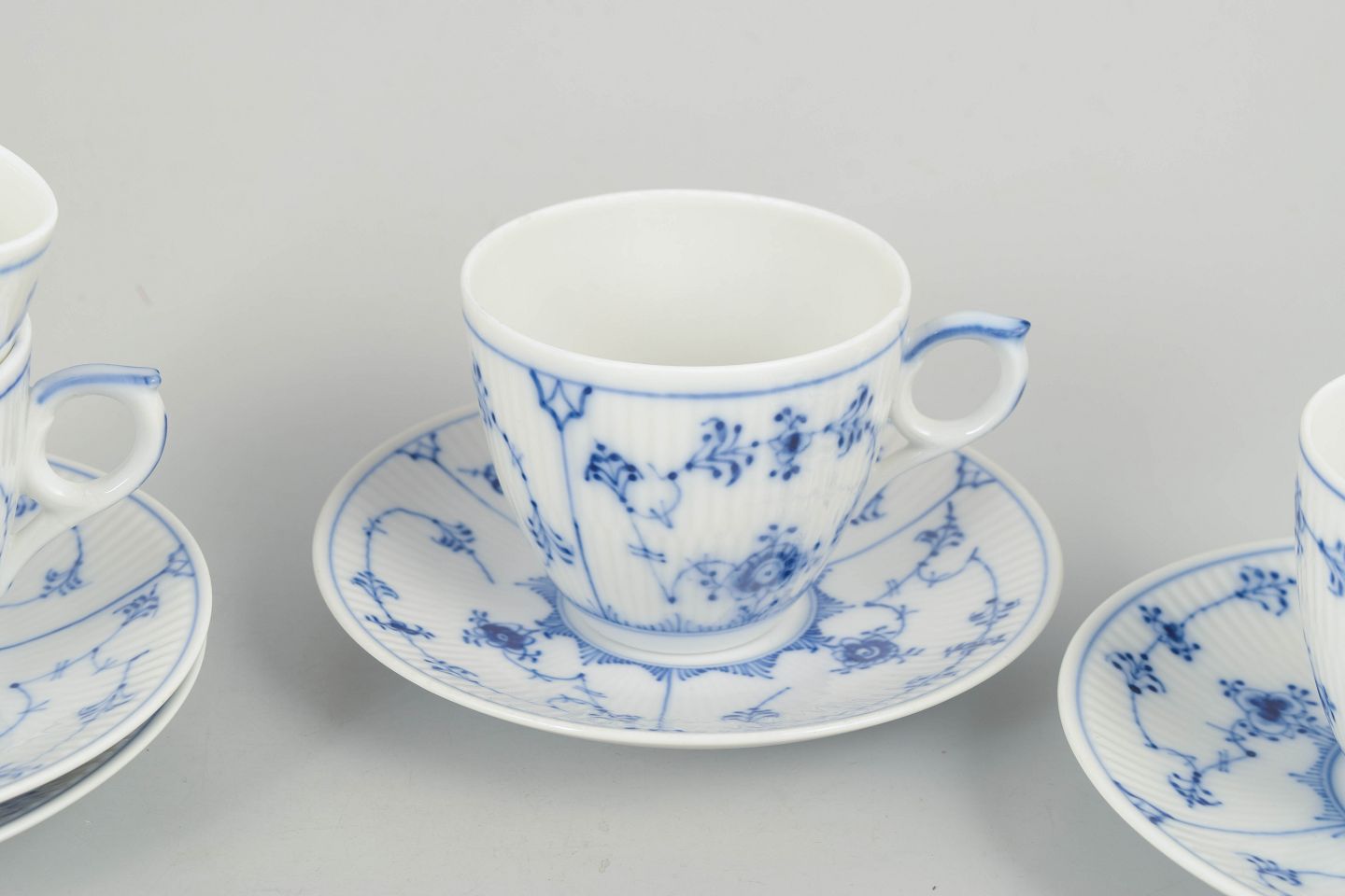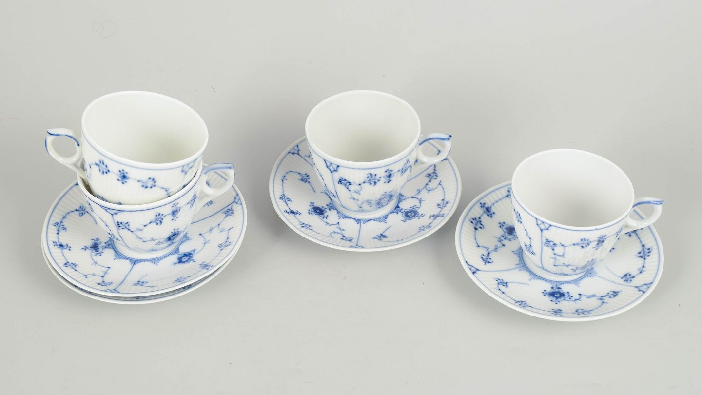 Royal Copenhagen Musselmalet Riflet, sæt af fire kaffekopper med underkopper.