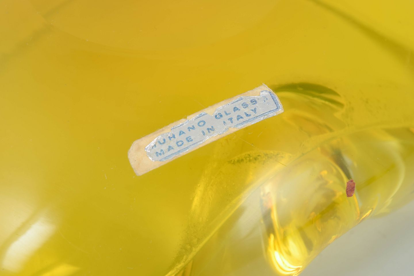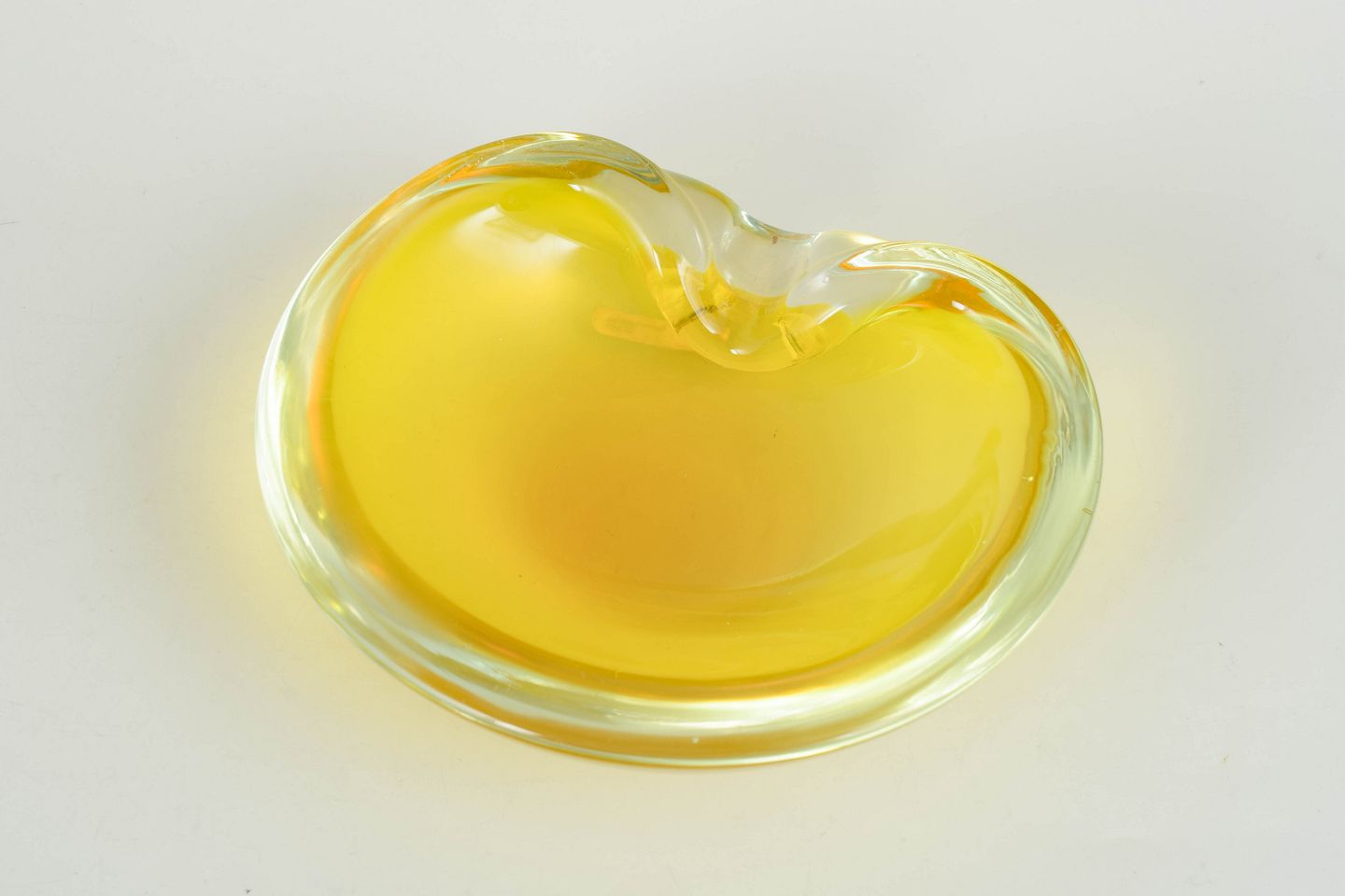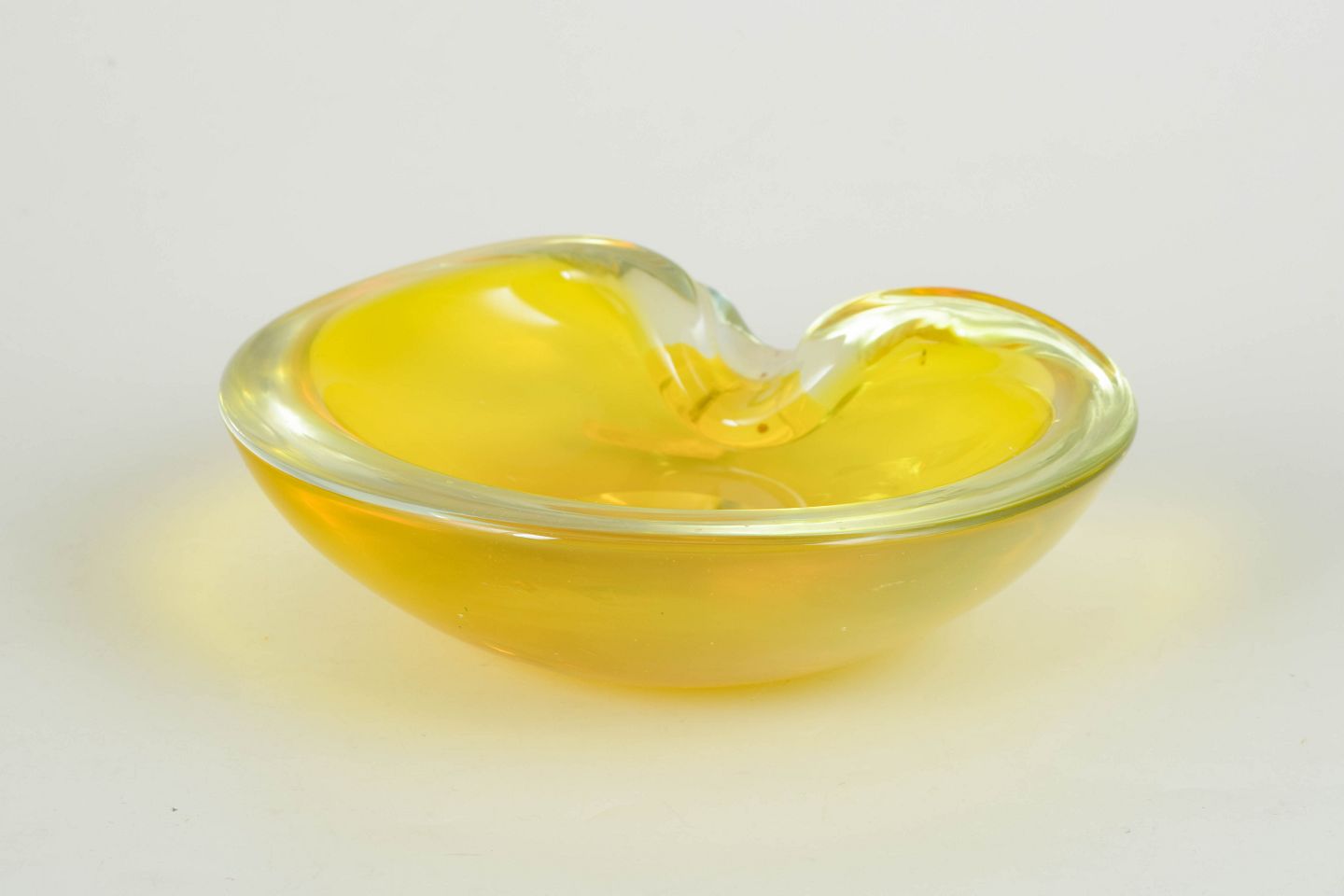 Organisk formet kunstglasskål i gult glas med klar rand og blødt bølgende form. Original mærkat “Murano Glass – Made in Italy”.