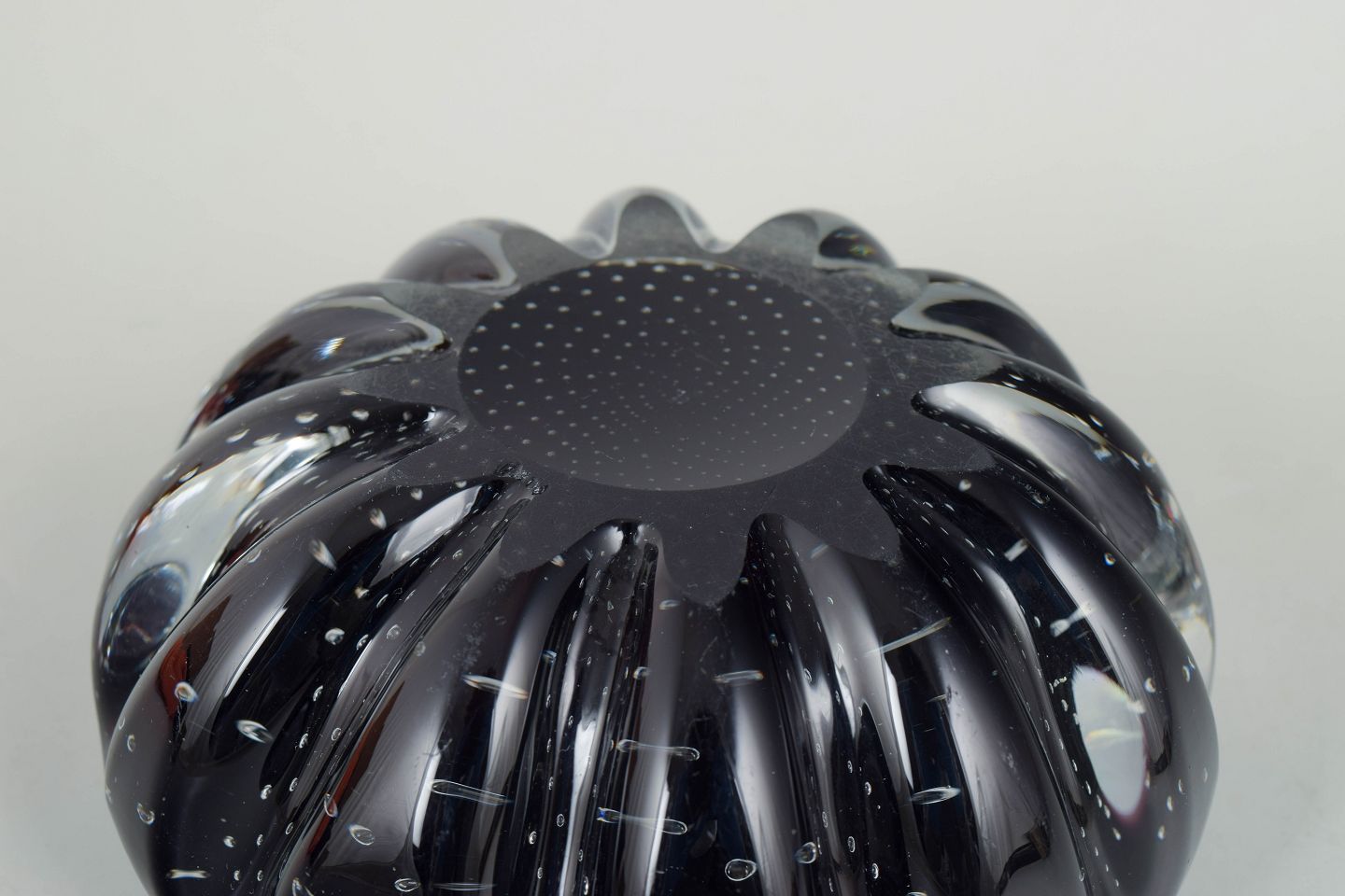 Kraftig kunstglasskål i mørkt glas med indkapslede luftbobler og organisk bølgende rand, udført i karakteristisk Murano-stil med skulpturel form.