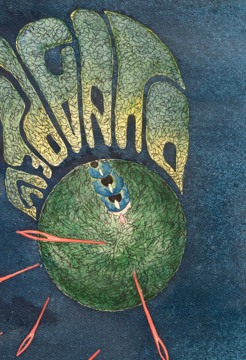 Surrealistisk komposition med symbolistiske og drømmeagtige elementer. Motivet viser en abstrakt rumlig scene med en grøn sfærisk form og stiliserede vingeformer omgivet af røde lineære former mod en mørk blå baggrund, over et geometrisk felt med tal og tegn. Signeret H. Stenberg og med titel : “På väg hem”.