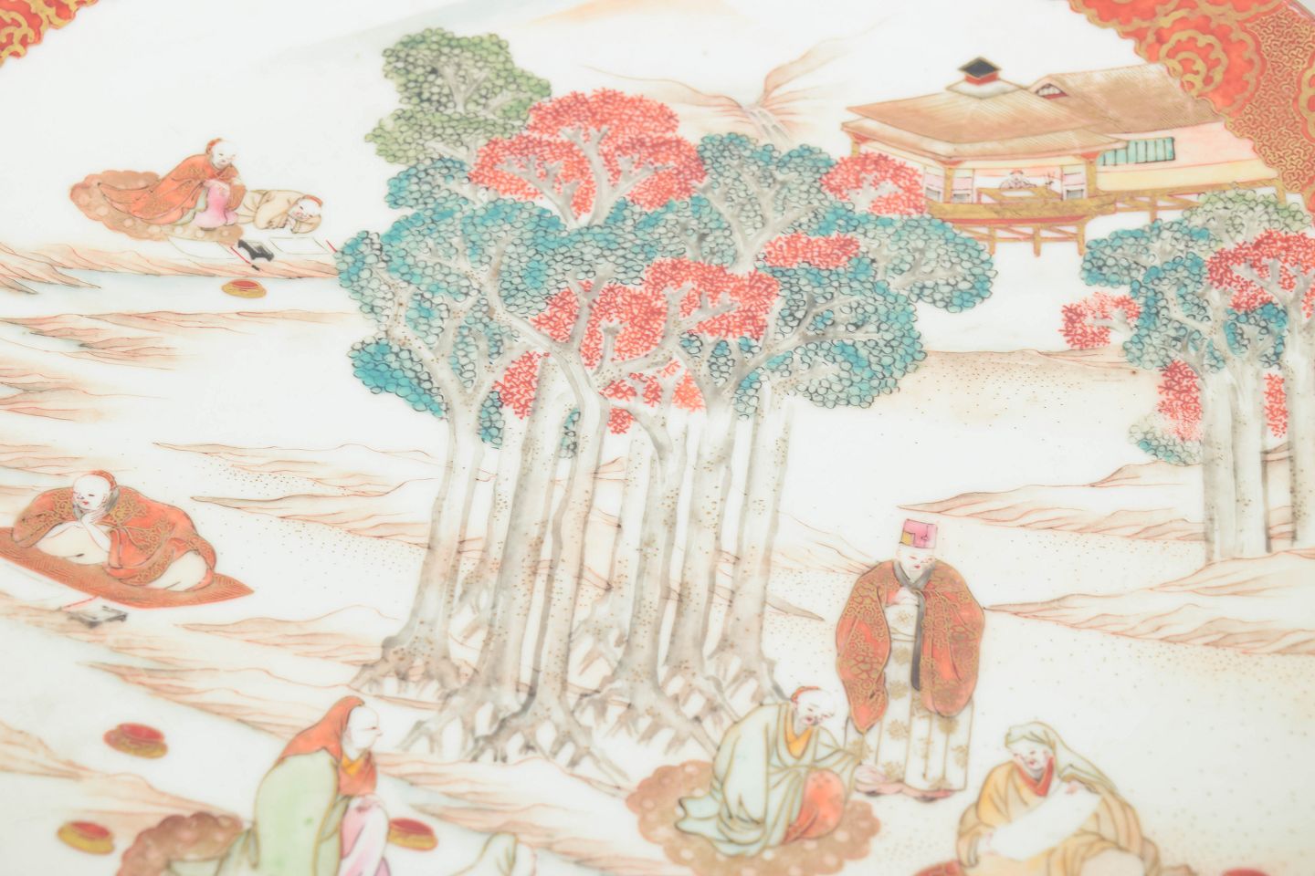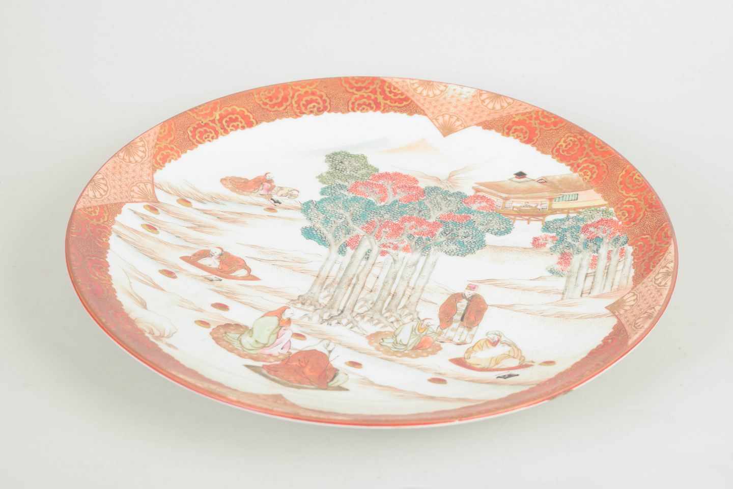 Stort rundt fad i porcelæn med håndmalet dekoration i rød, grøn og gylden farveholdning med figur- og landskabsmotiv. Signeret på undersiden.
