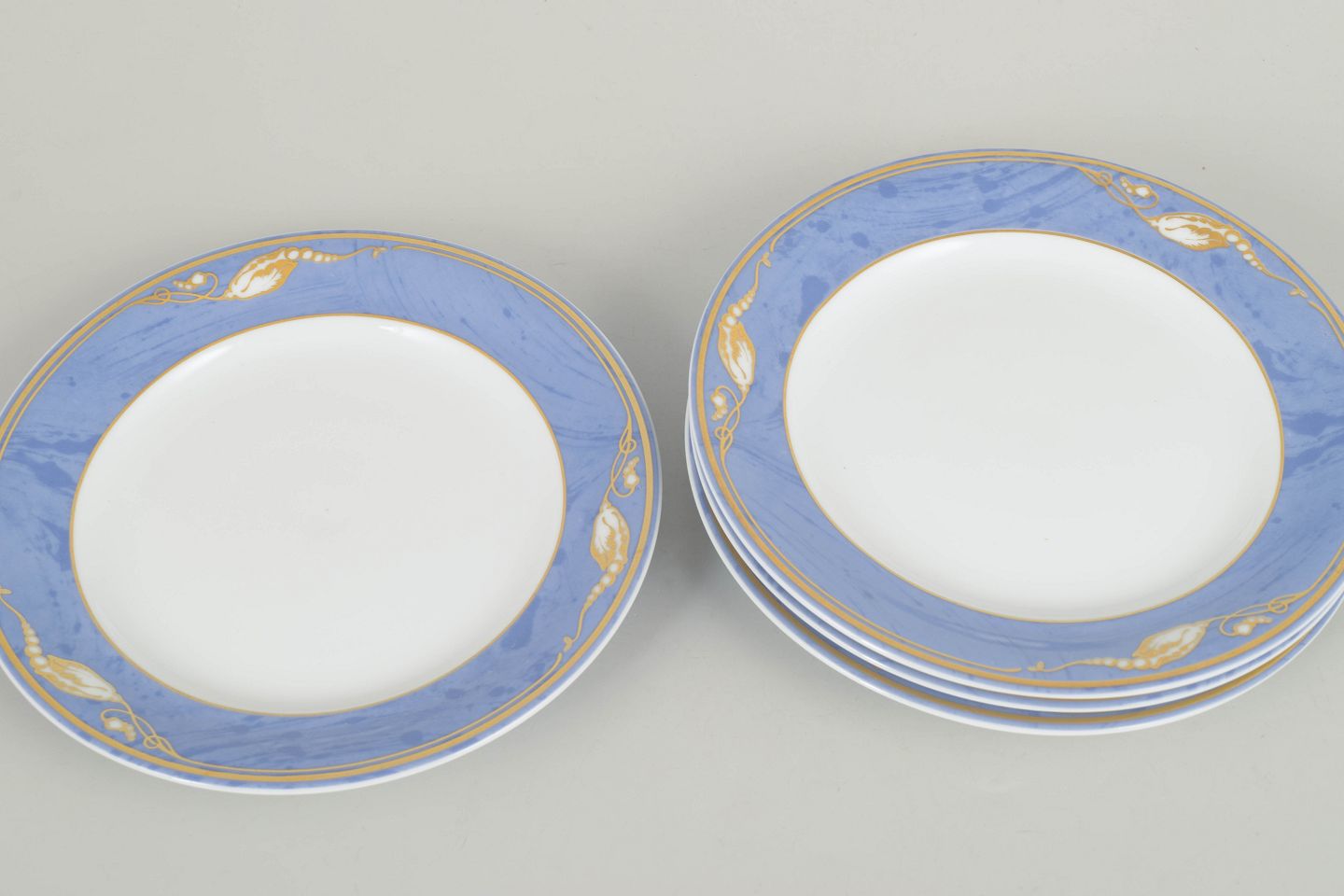 Fine porcelain salad plates in the Blue Magnolia pattern, model 619, produced in the 1990s. First factory quality and factory marked.