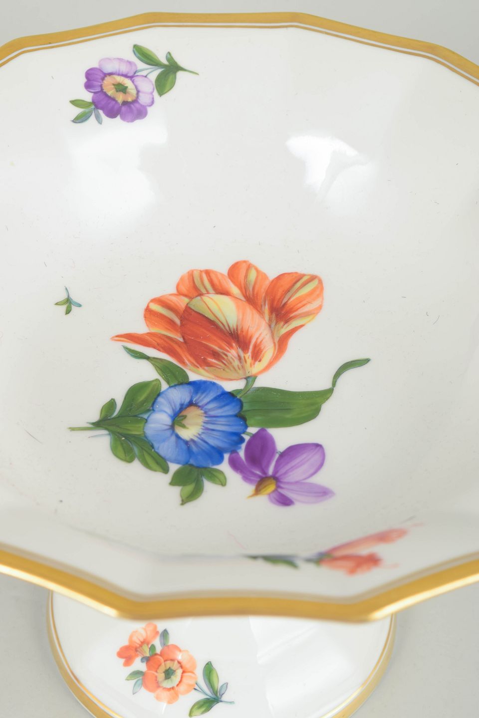 Elegant porcelain compote decorated with hand-painted floral motifs in the Saxon Flower pattern. Produced in first factory quality with a classic elevated form and balanced proportions, model 627/8531, dated 1961.