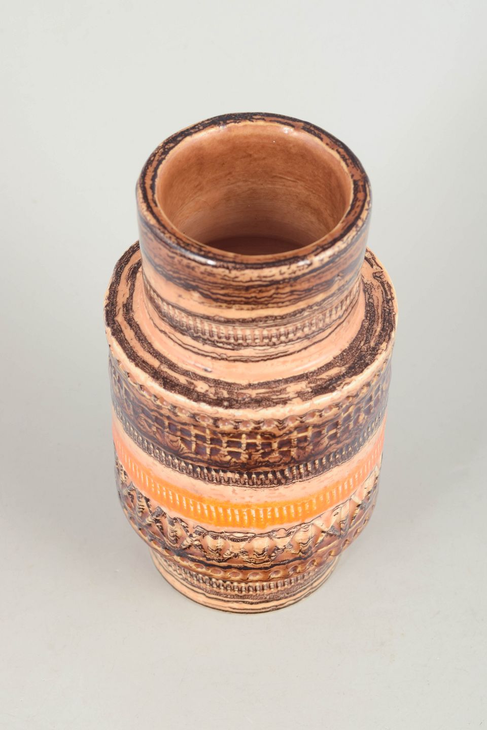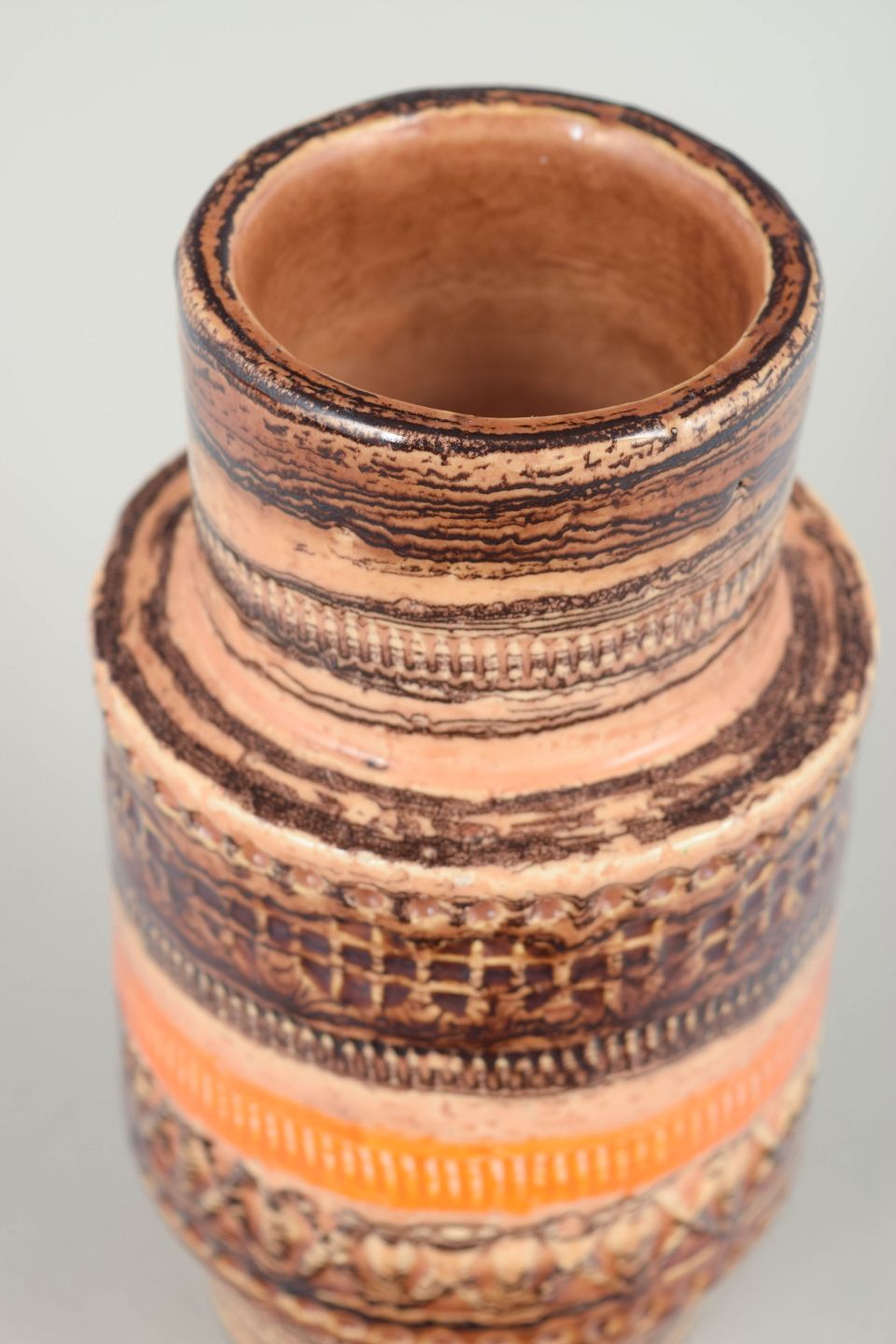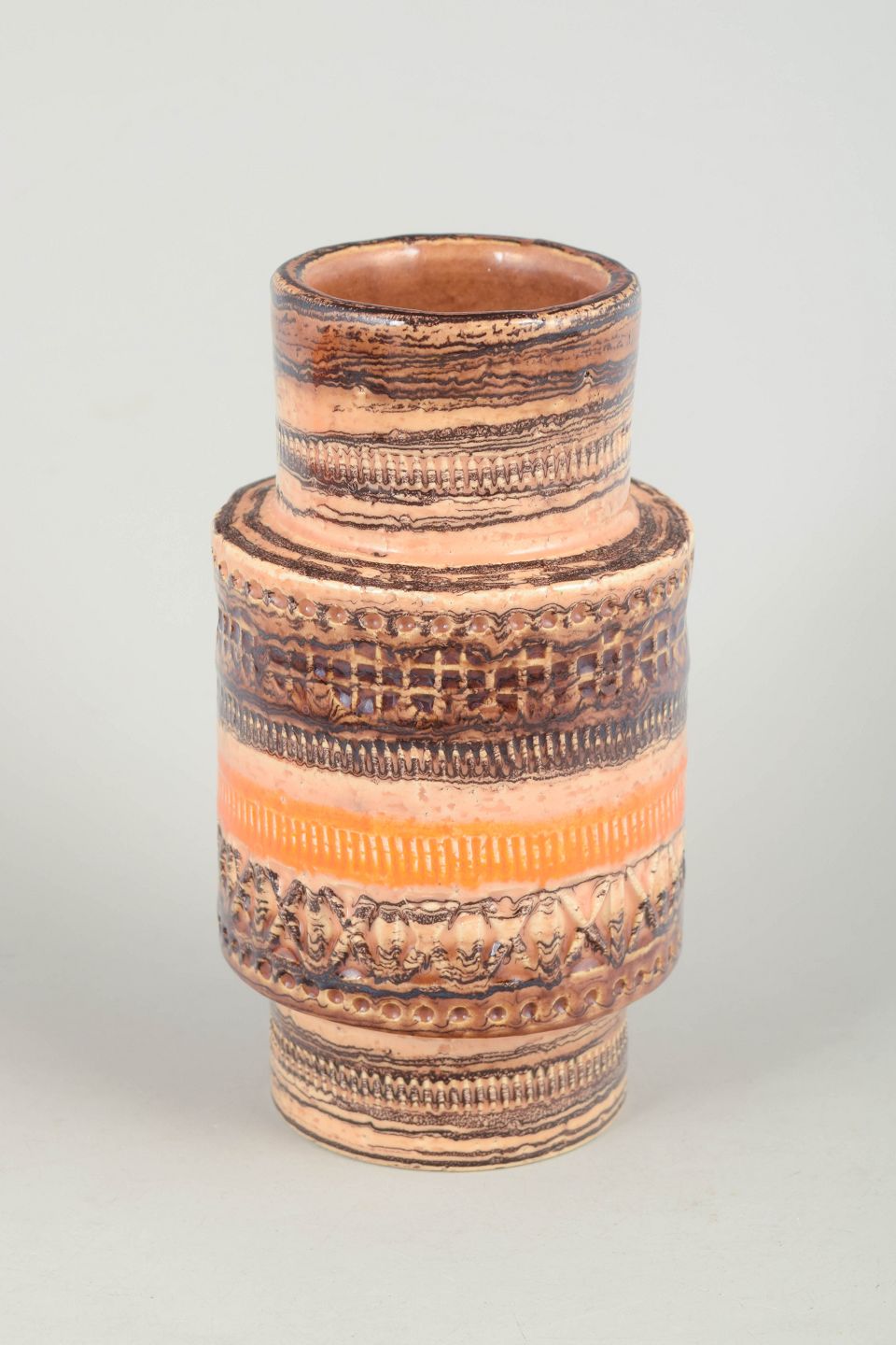 Decorative stoneware vase with characteristic relief and horizontal bands in earthy tones and orange hues, executed in classic Italian 1970s style.