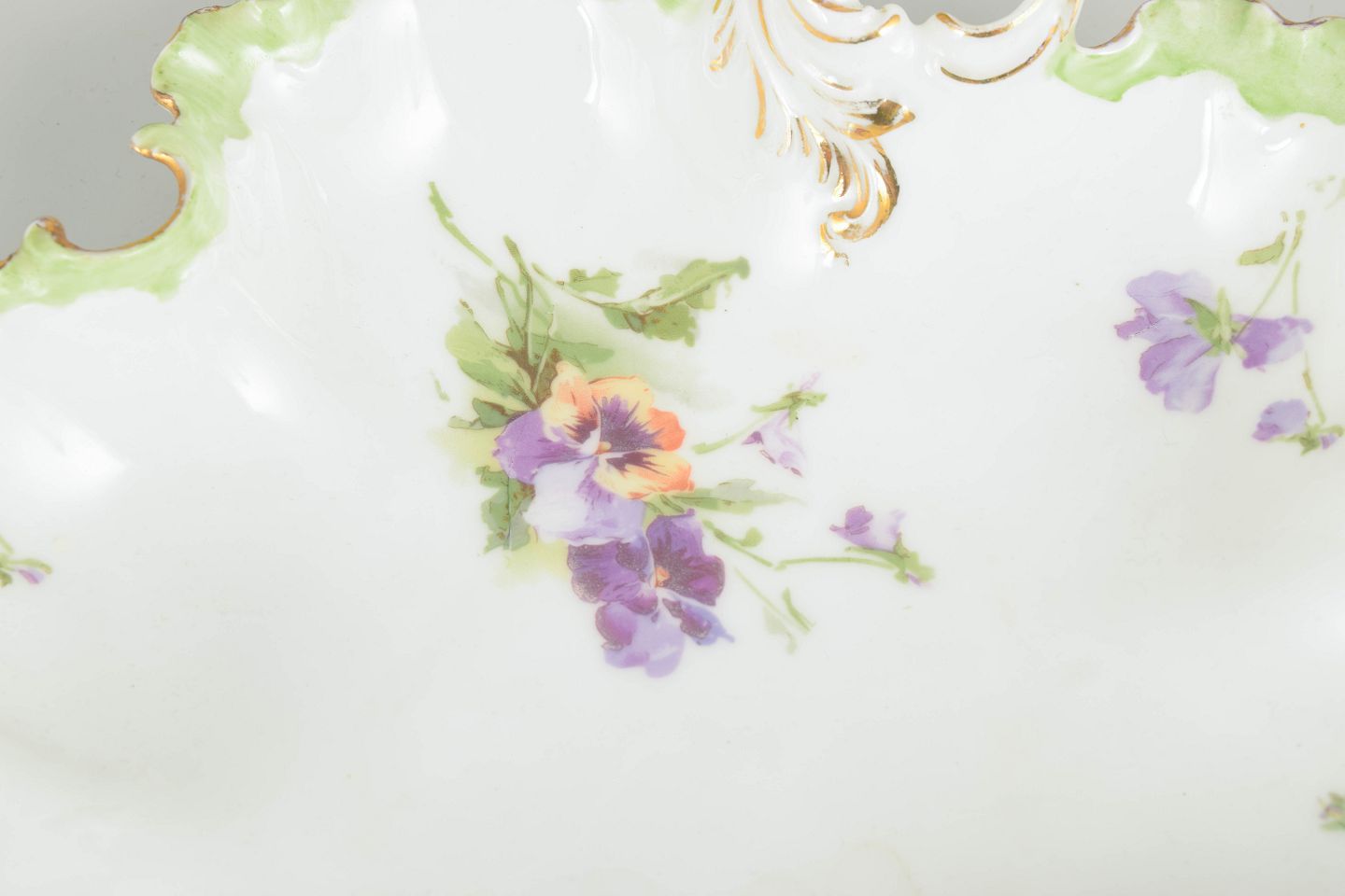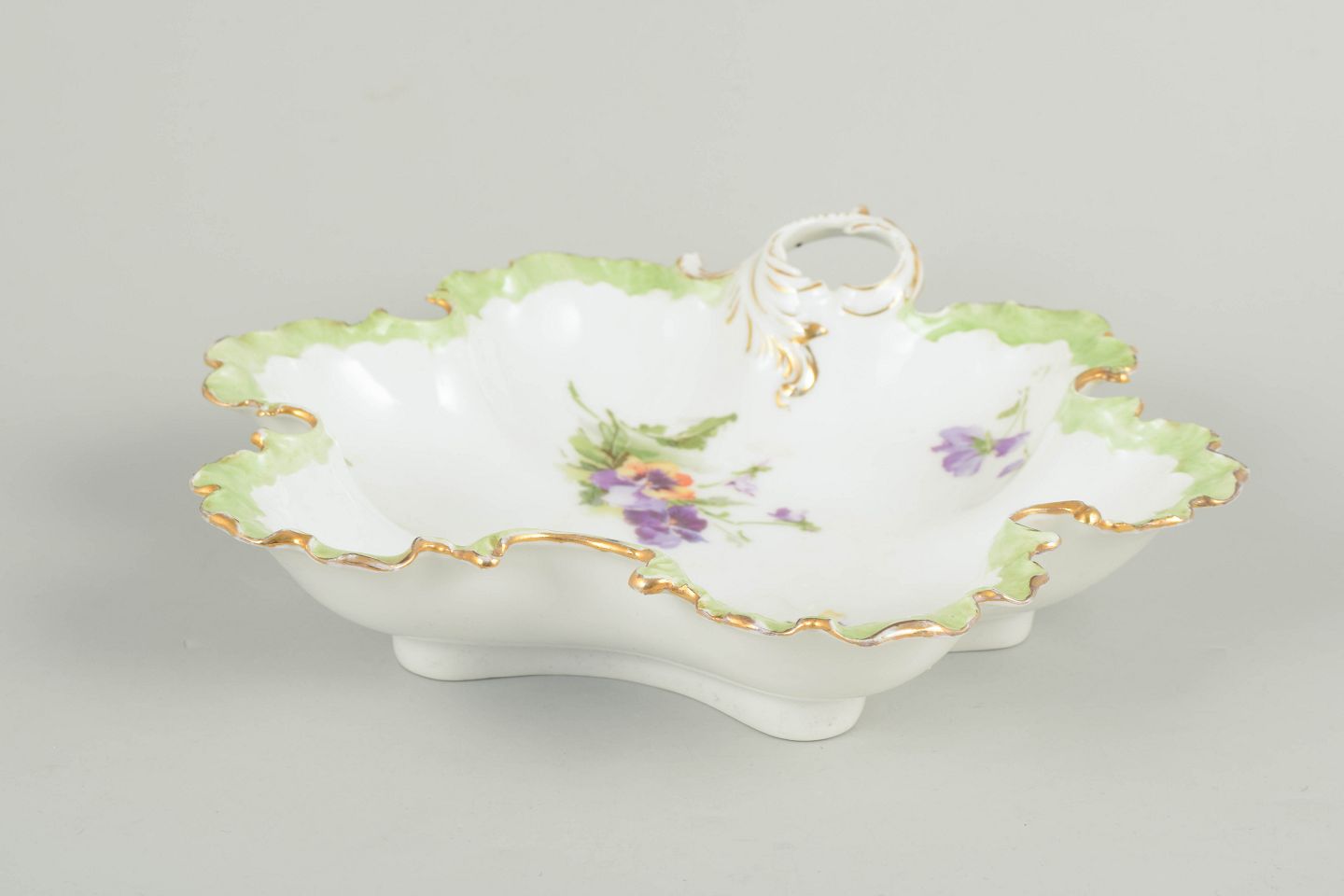 Decorative porcelain bowl with a scalloped edge and pierced handle, adorned with hand-painted floral motifs in purple and green tones and gilt detailing, characteristic of Rosenthal’s early 20th century production.