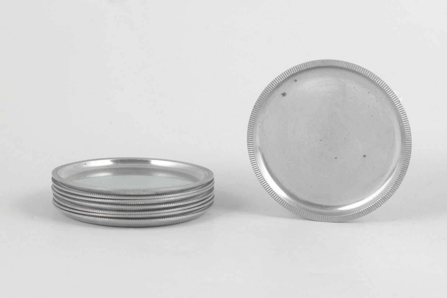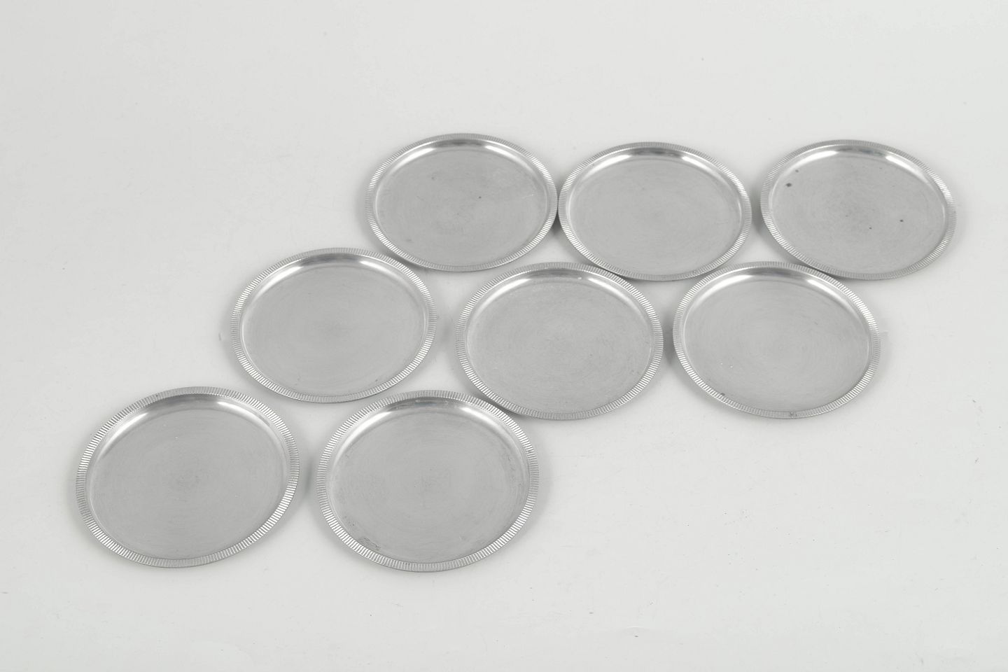 Sæt af otte flaskeunderlag i tin med riflet kant og enkelt art deco formsprog. Model 2634.