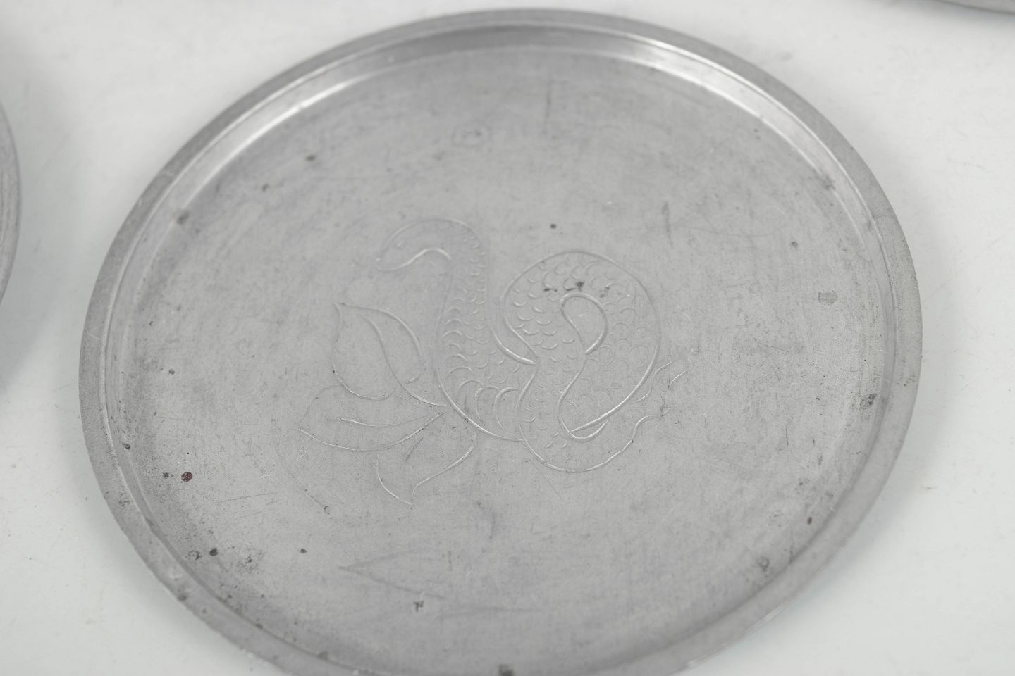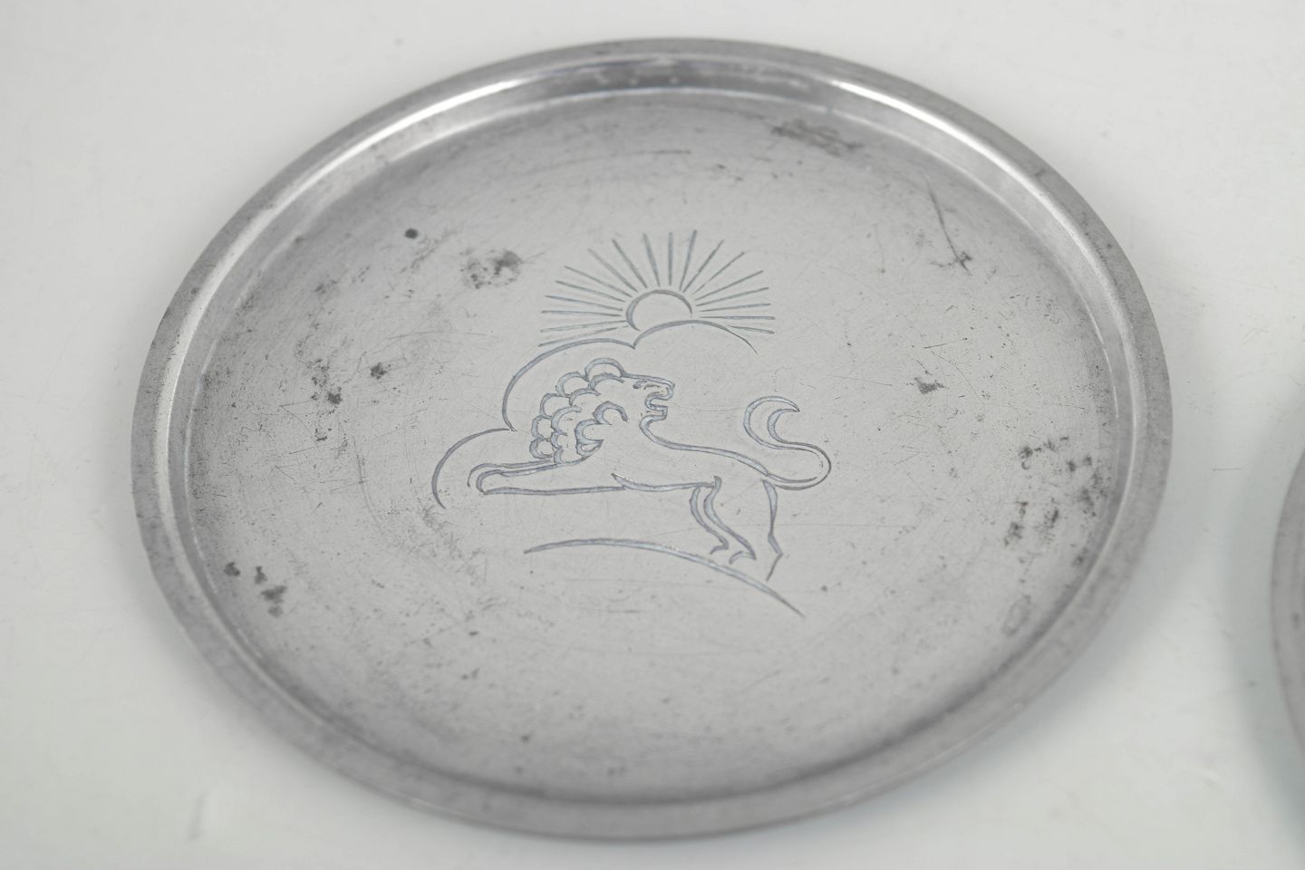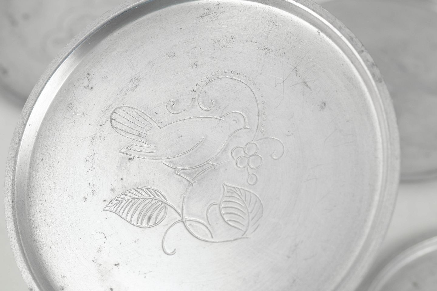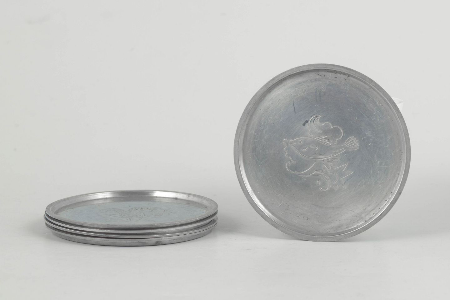 Sæt af fem flaskeunderlag i tin med indgraverede dyremotiver i et stiliseret art deco formsprog. Model 1176.