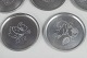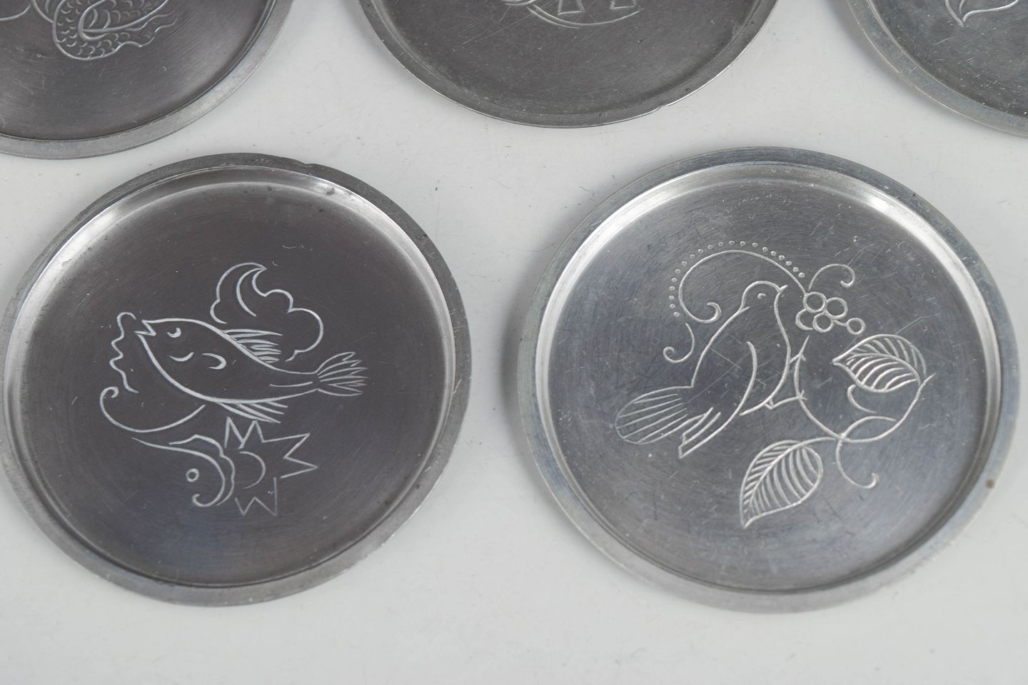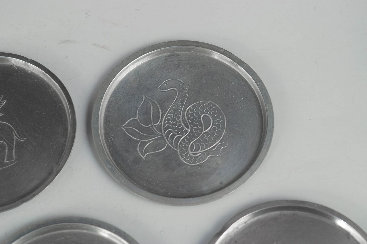 Sæt af otte flaskeunderlag i tin med indgraverede dyremotiver i et stiliseret art deco formsprog. Model 1166.