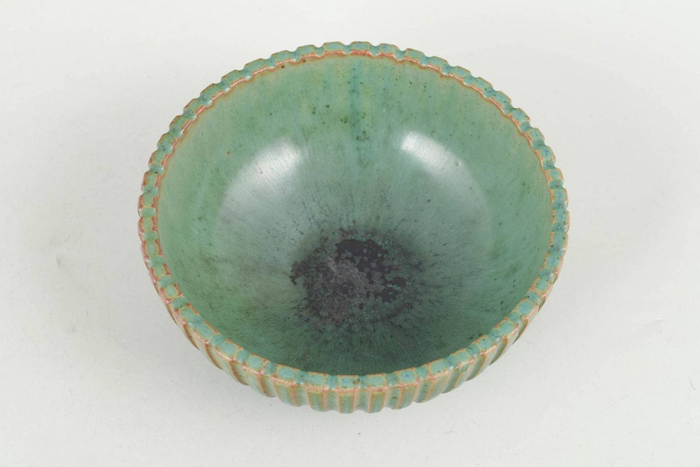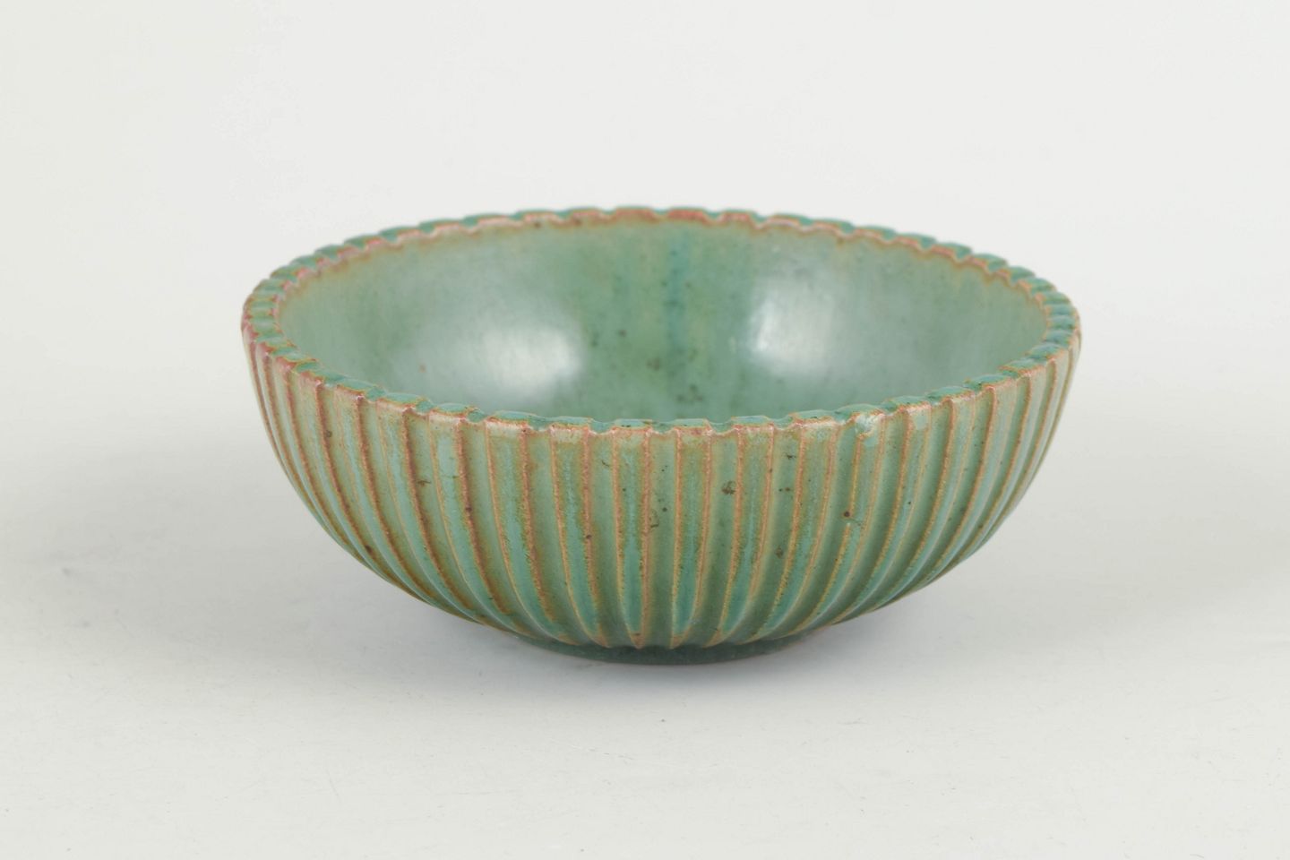 Lav skål i stentøj med riflet korpus og grønlig glasur med fine nuancer. Model 120.